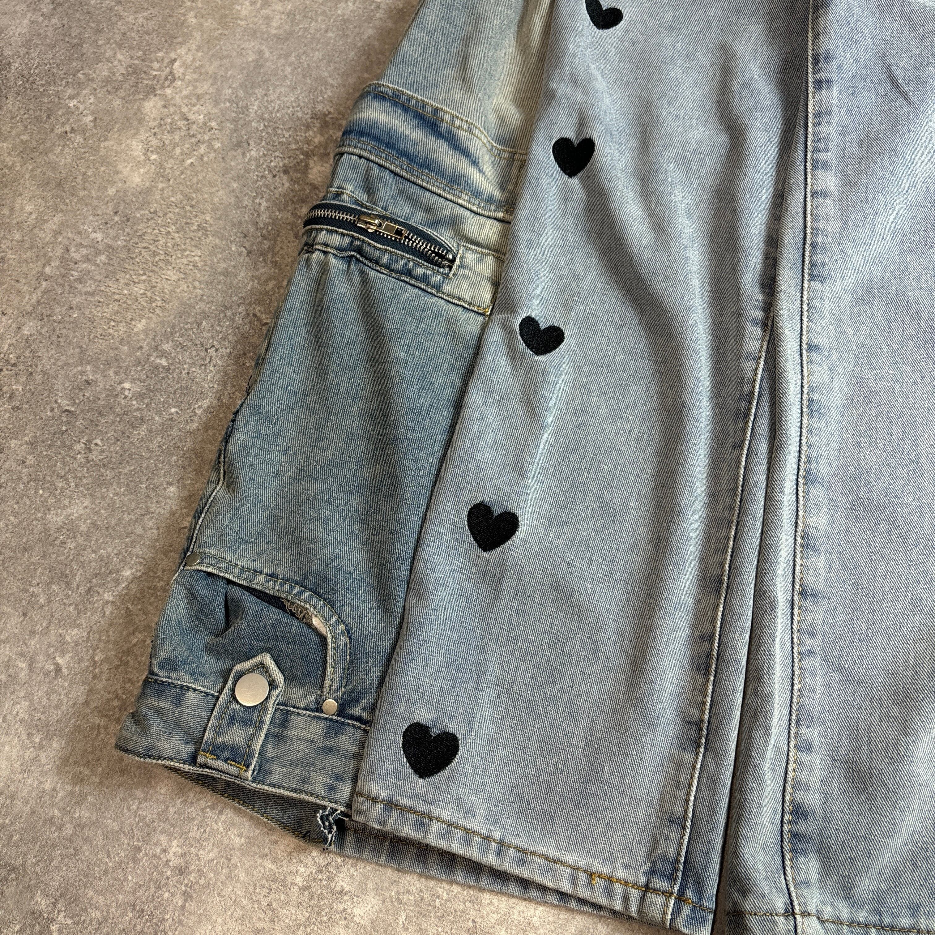 フロントにはかわいいブラックのハートモチーフをランダムに配置し、甘さとストリート感をミックスした1本に仕上げました。