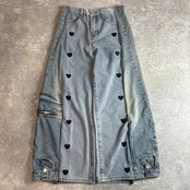 古着のデニムパンツを再構築し、サイドに別布をプラスしたリメイクワイドパンツです。
