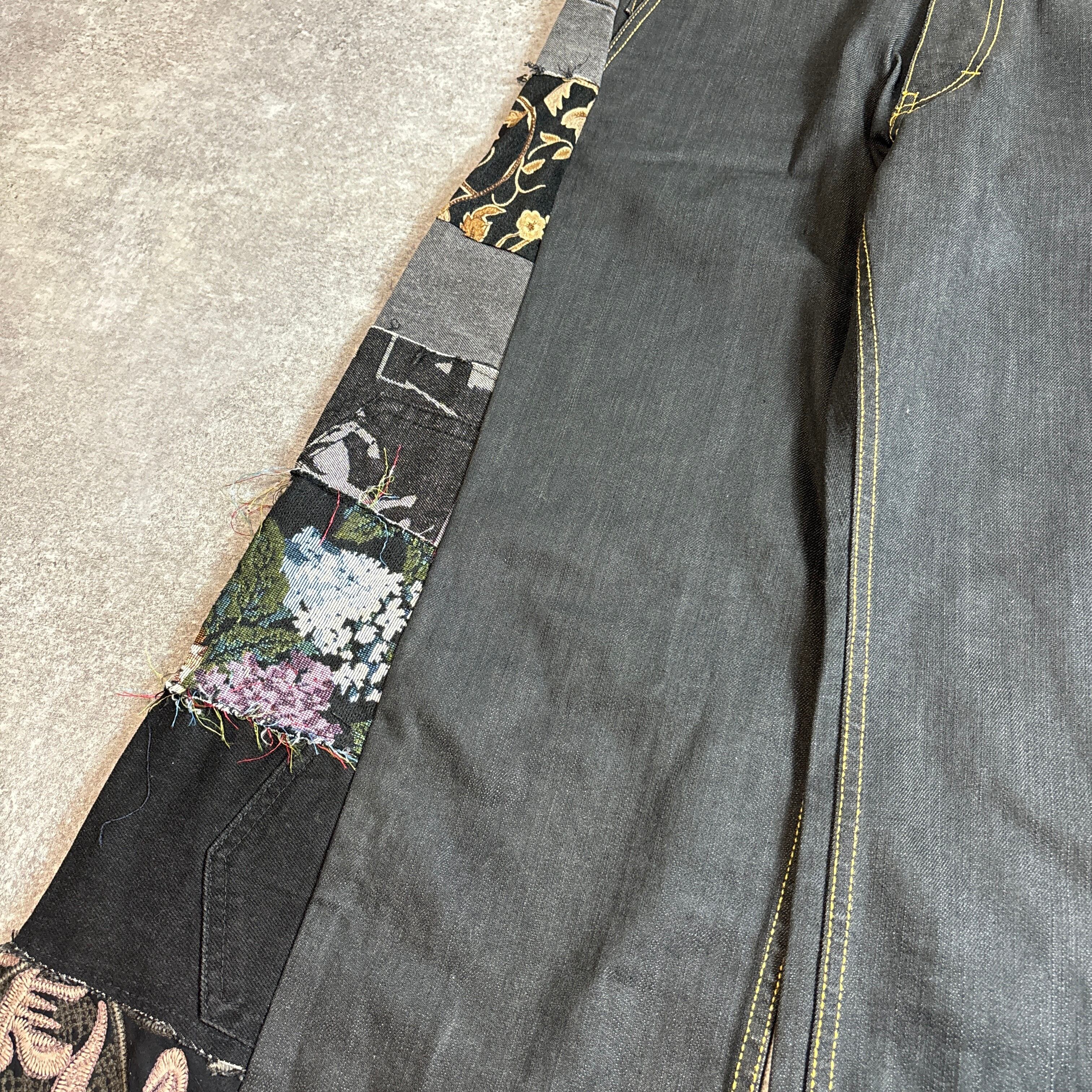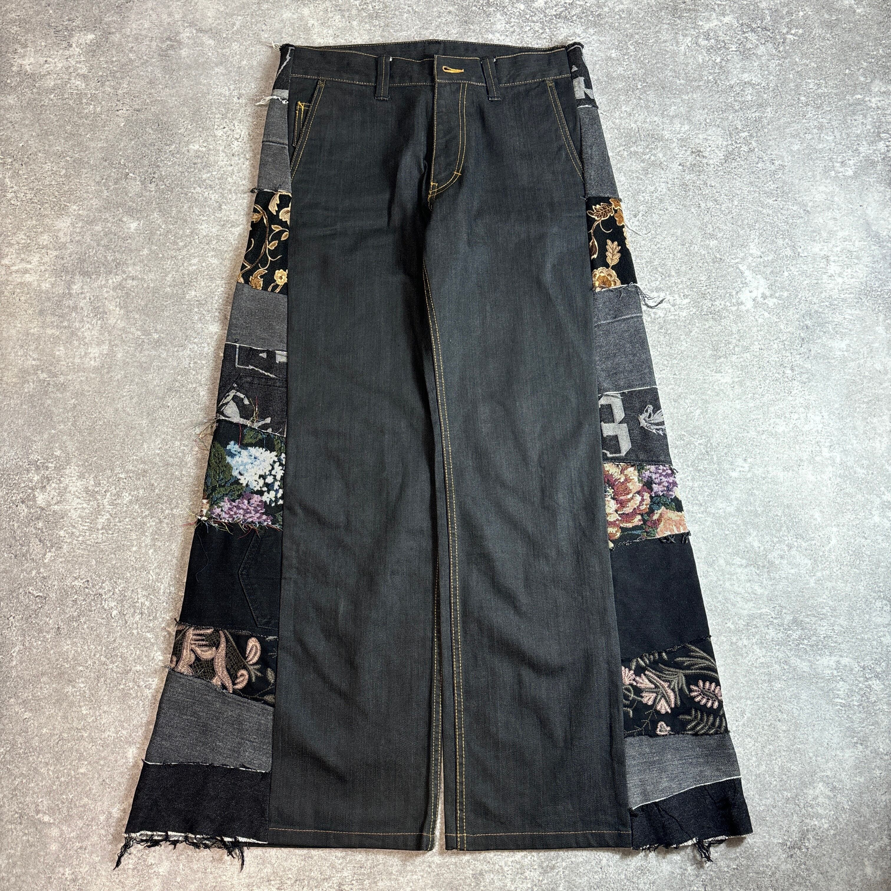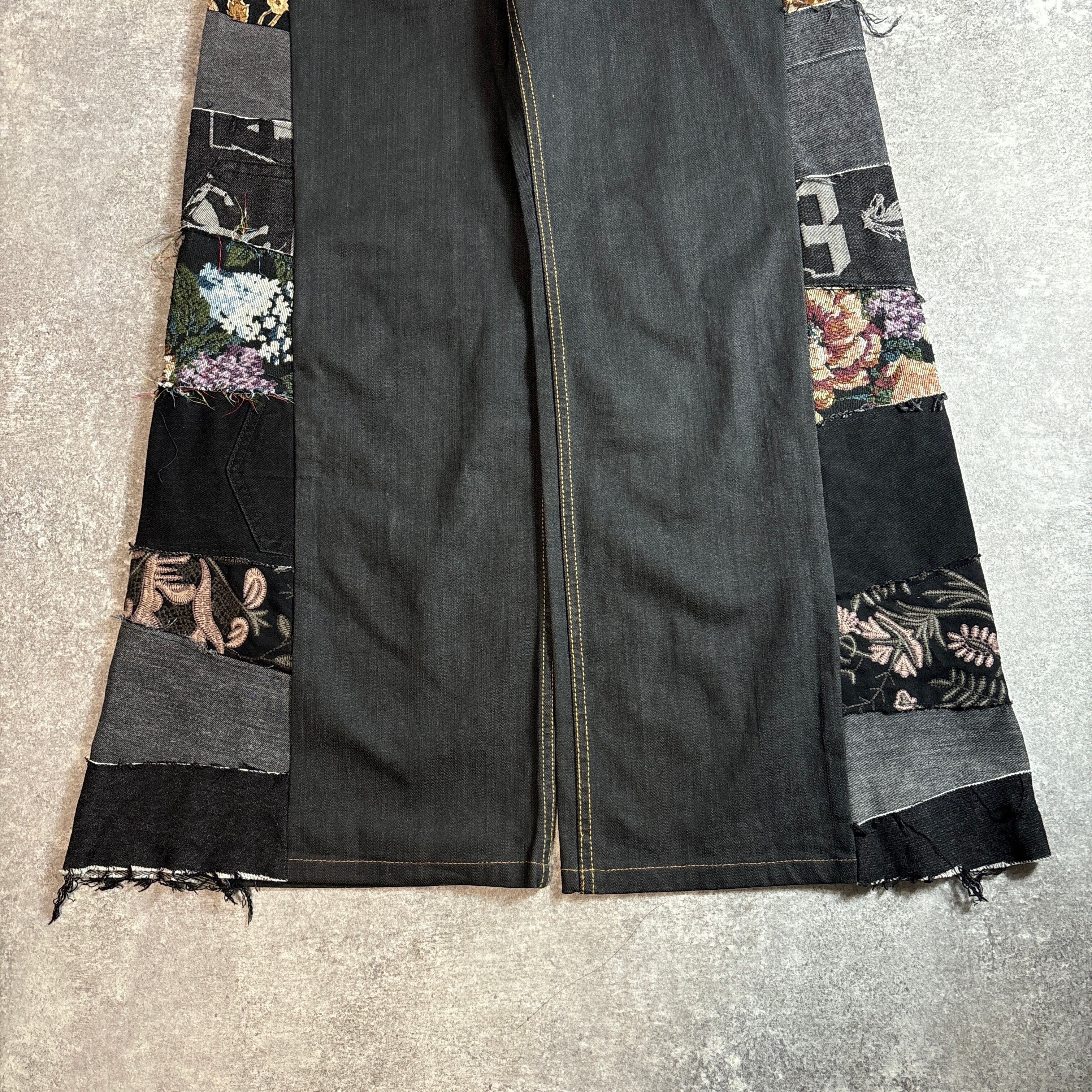 両サイドに施された様々なヴィンテージ生地のパッチワークが目を引く、唯一無二のリメイクパンツです。グレートーンのデニムに、花柄やロゴ、刺繍入りの異素材パーツをミックスし、ストリート×アートな雰囲気に仕上げました。