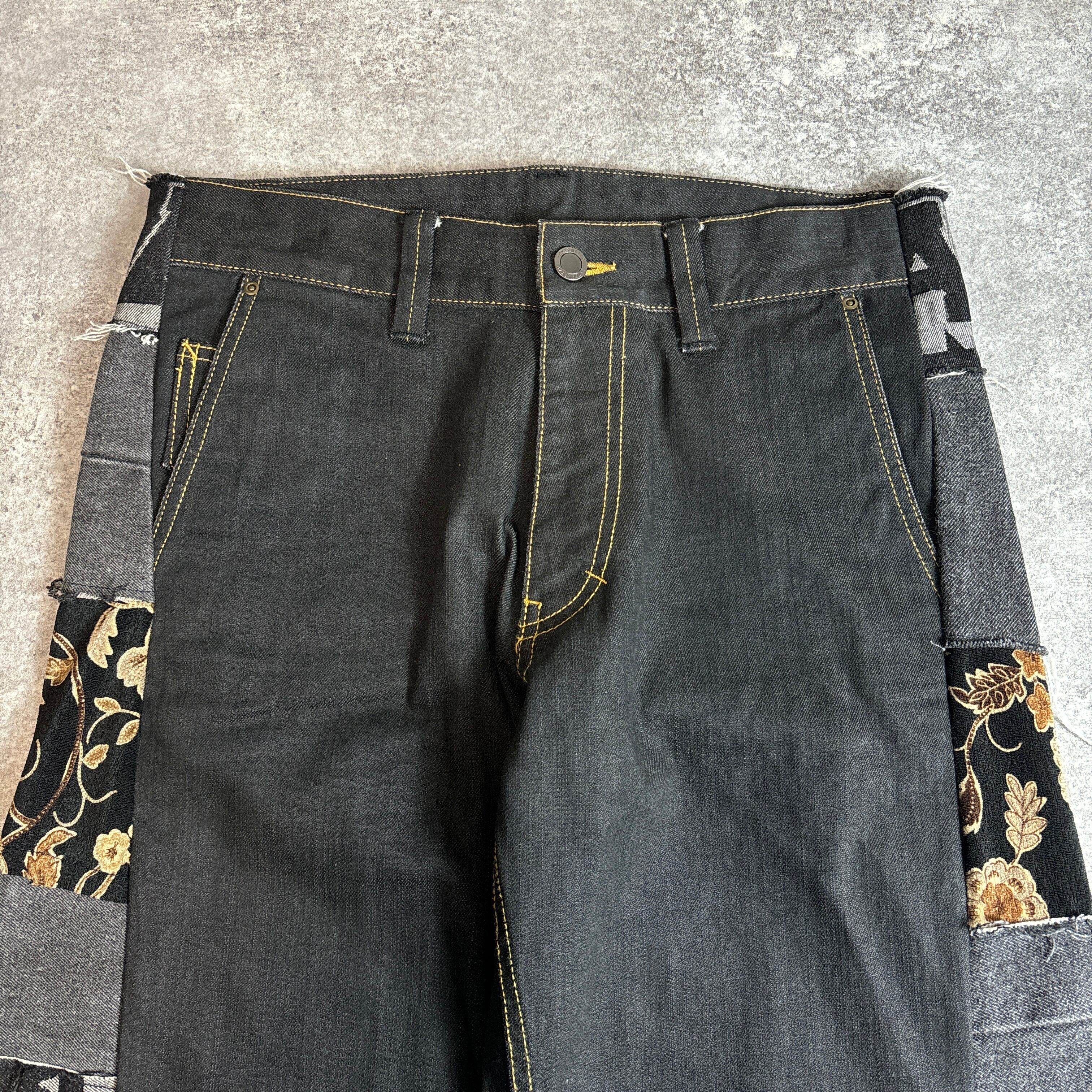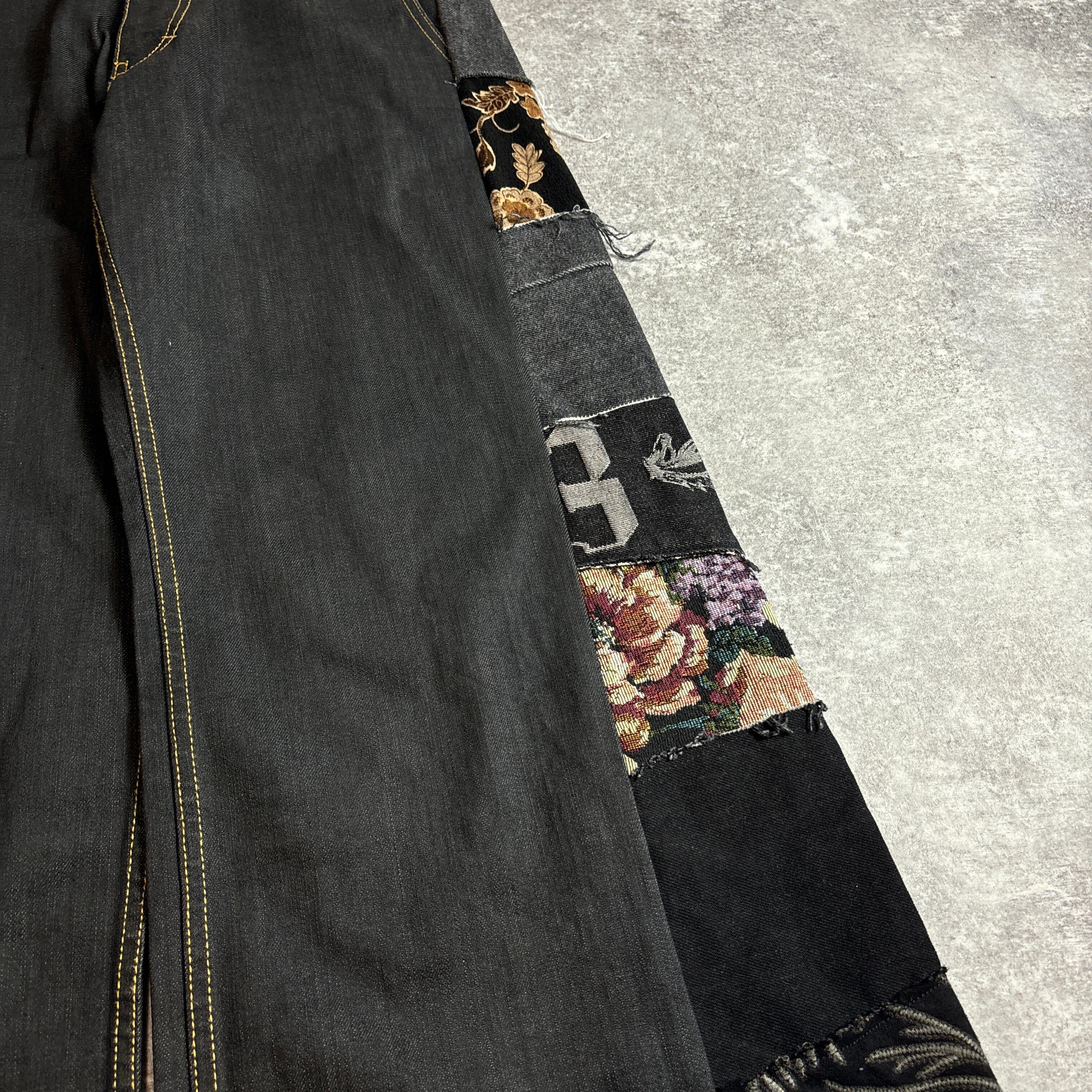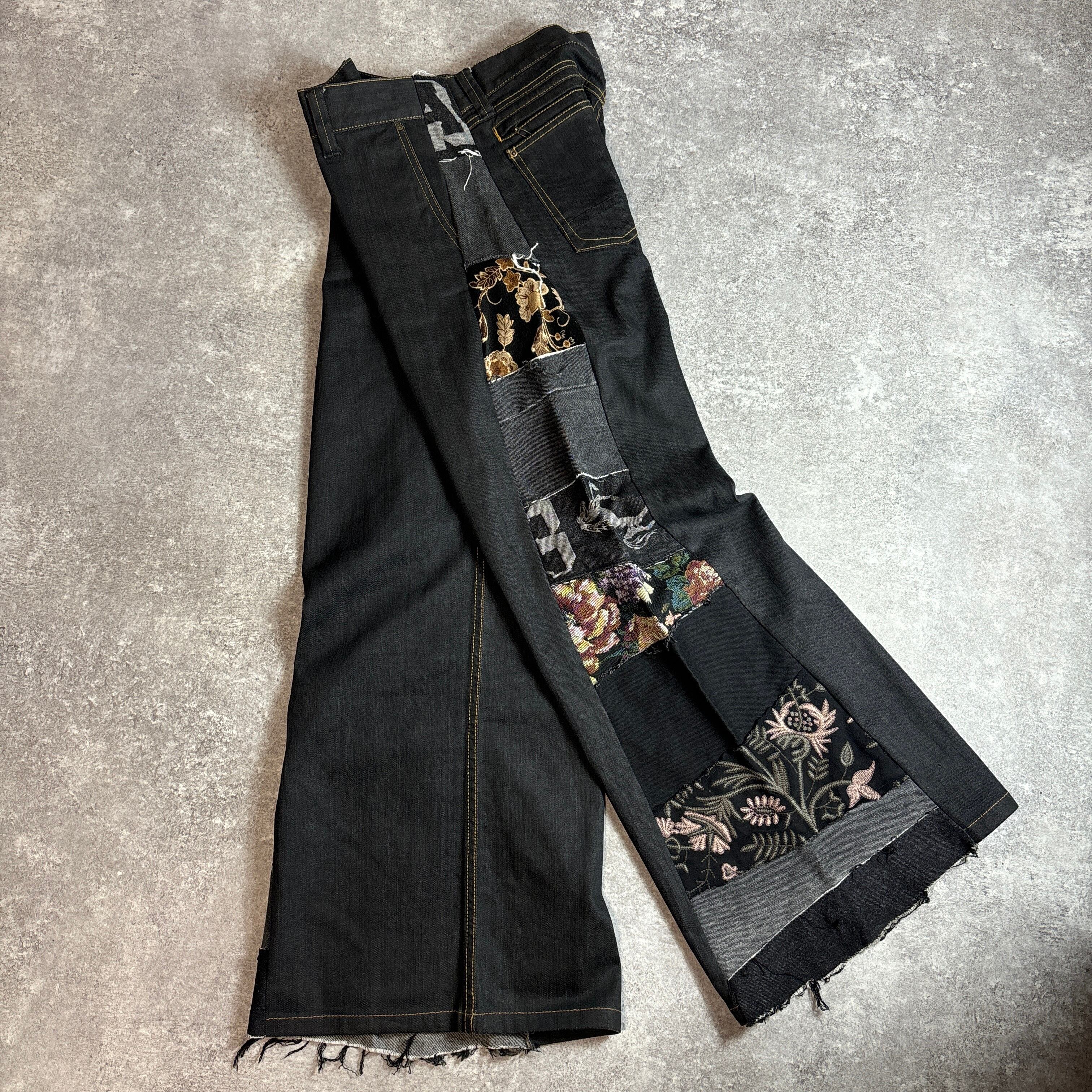 両サイドに施された様々なヴィンテージ生地のパッチワークが目を引く、唯一無二のリメイクパンツです。グレートーンのデニムに、花柄やロゴ、刺繍入りの異素材パーツをミックスし、ストリート×アートな雰囲気に仕上げました。