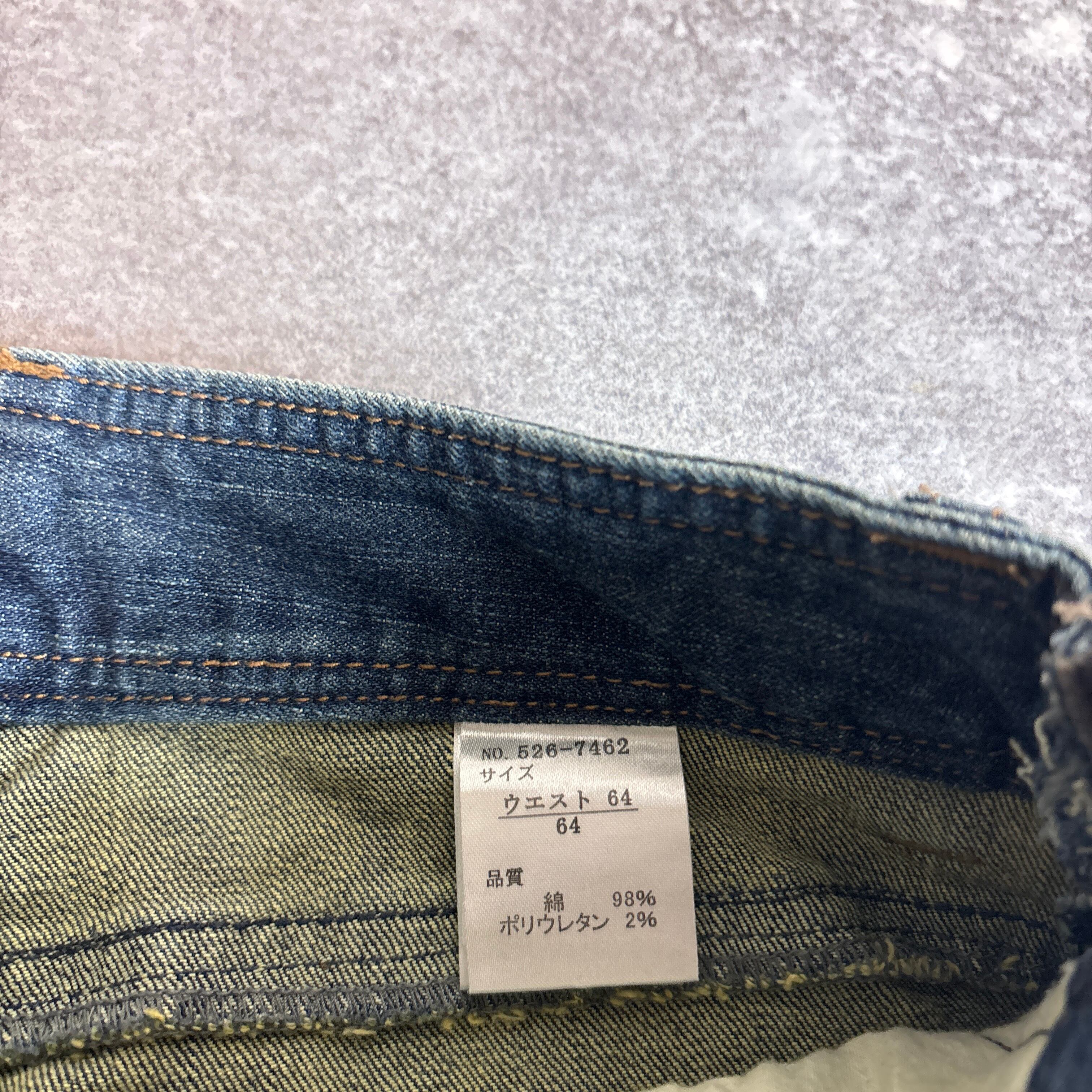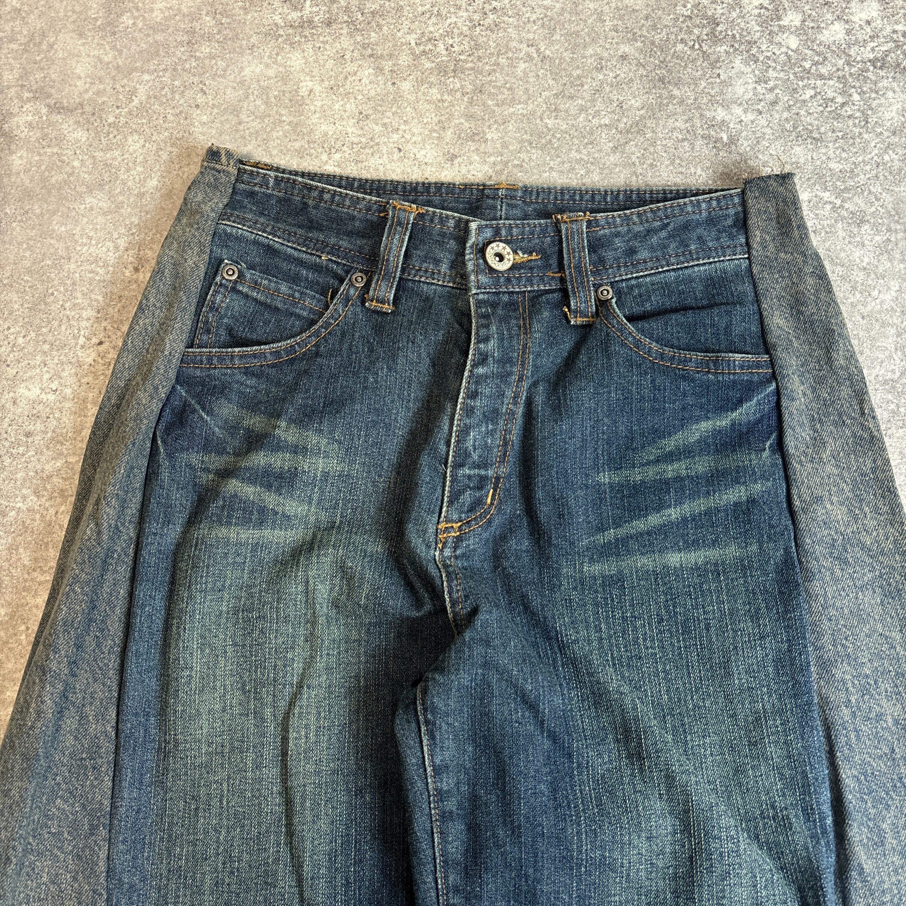濃淡の異なるデニムを組み合わせ、ユーズドの風合いを活かした一点モノのデザイン。