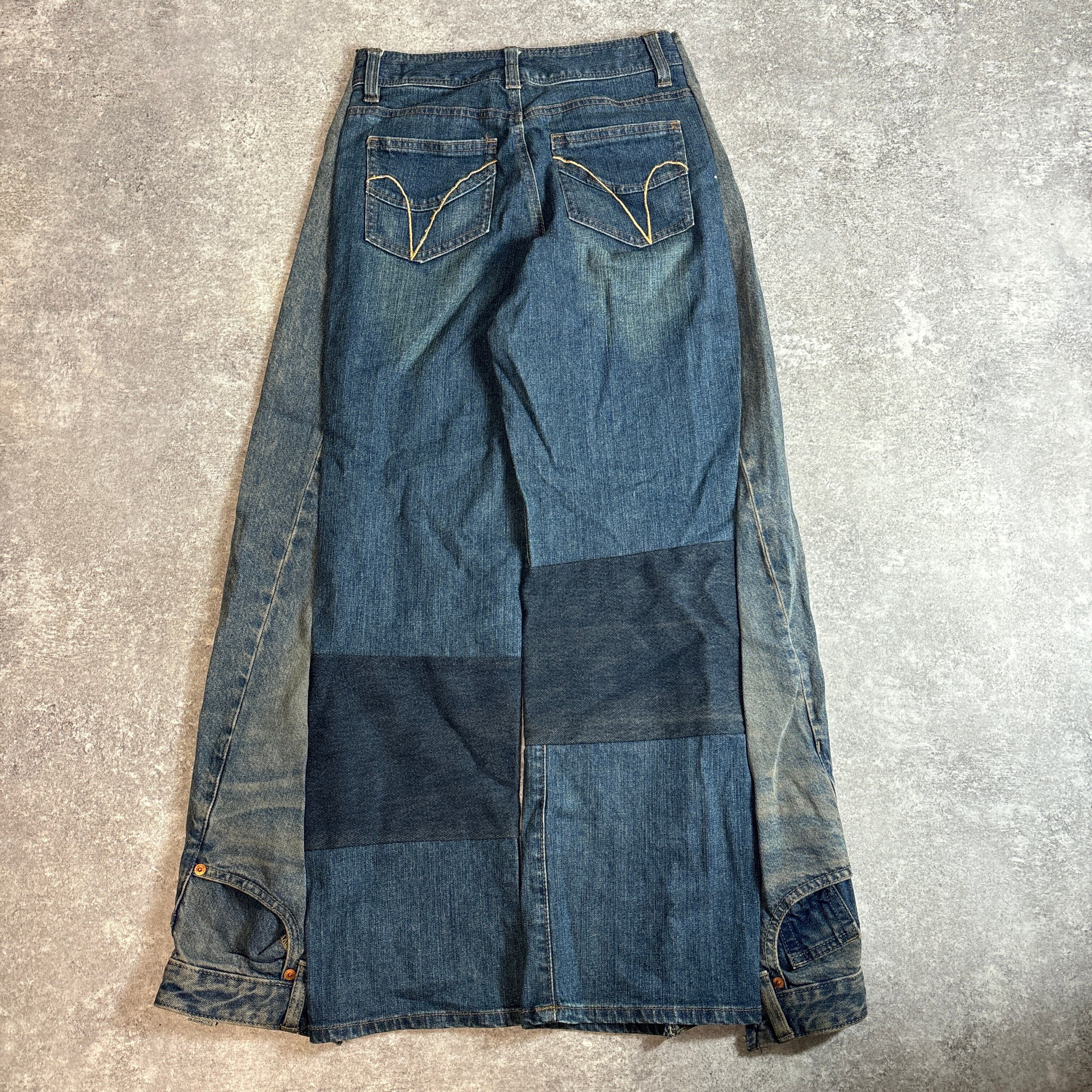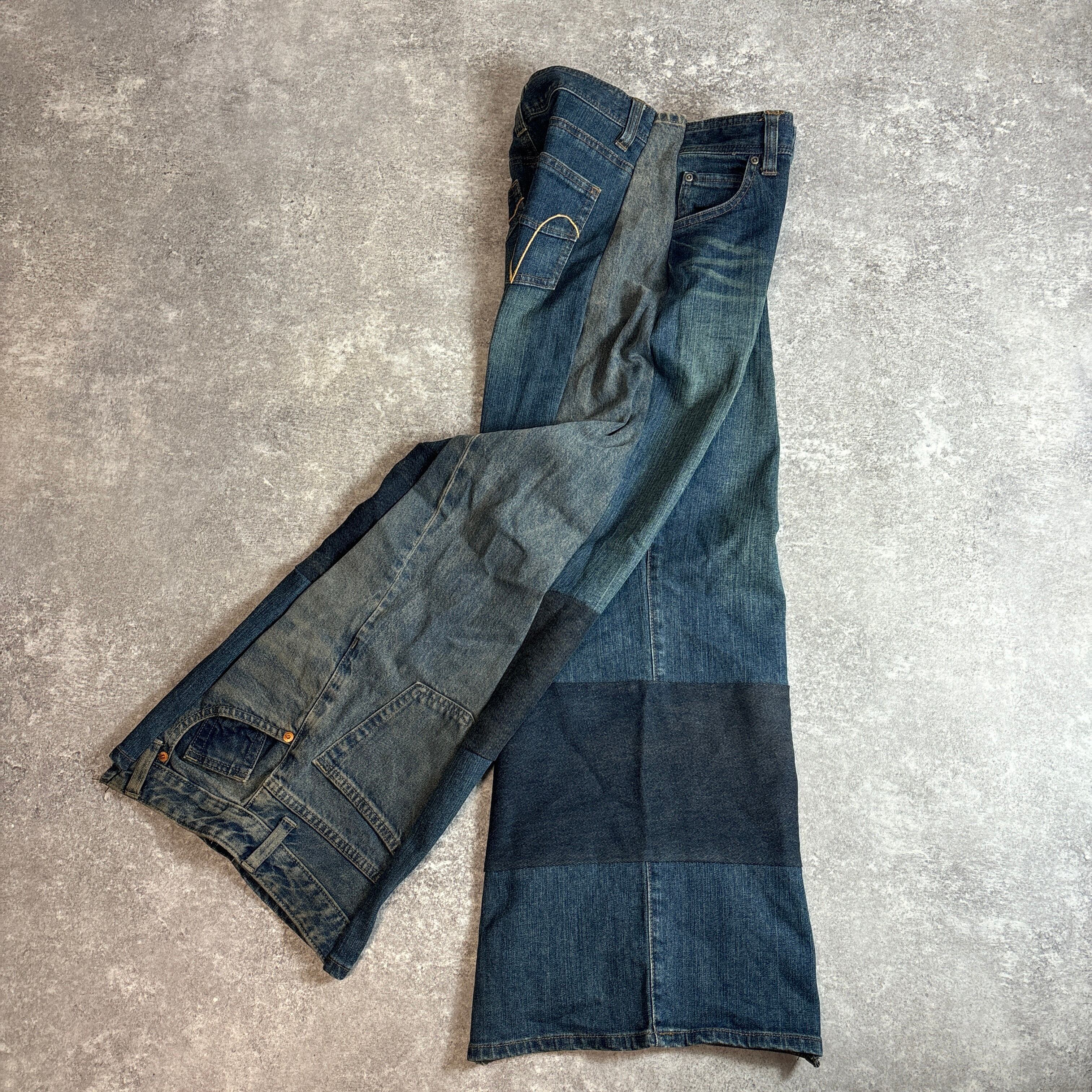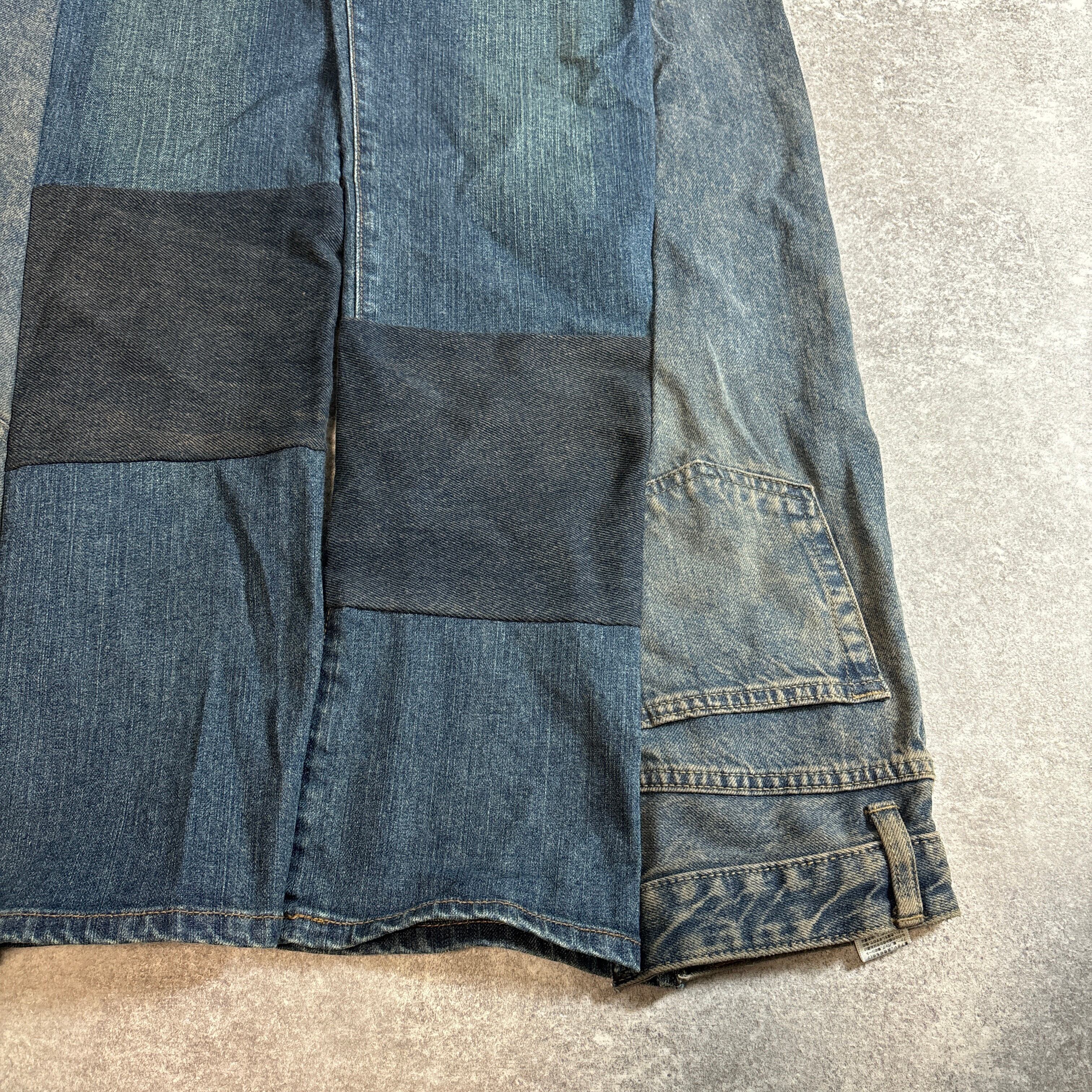 ヴィンテージ感あふれるデニムを大胆にパッチワークリメイクした、存在感抜群のワイドパンツです。
