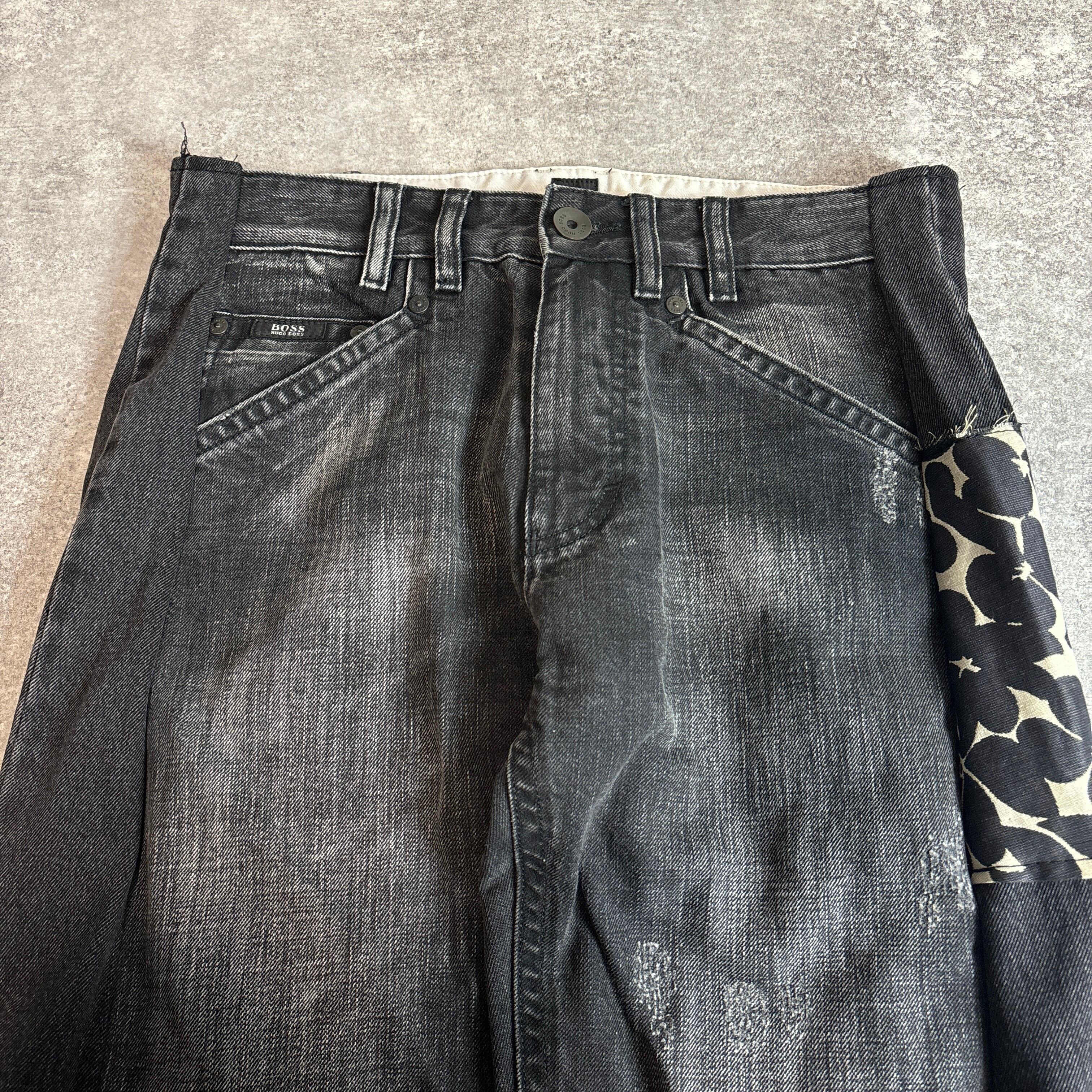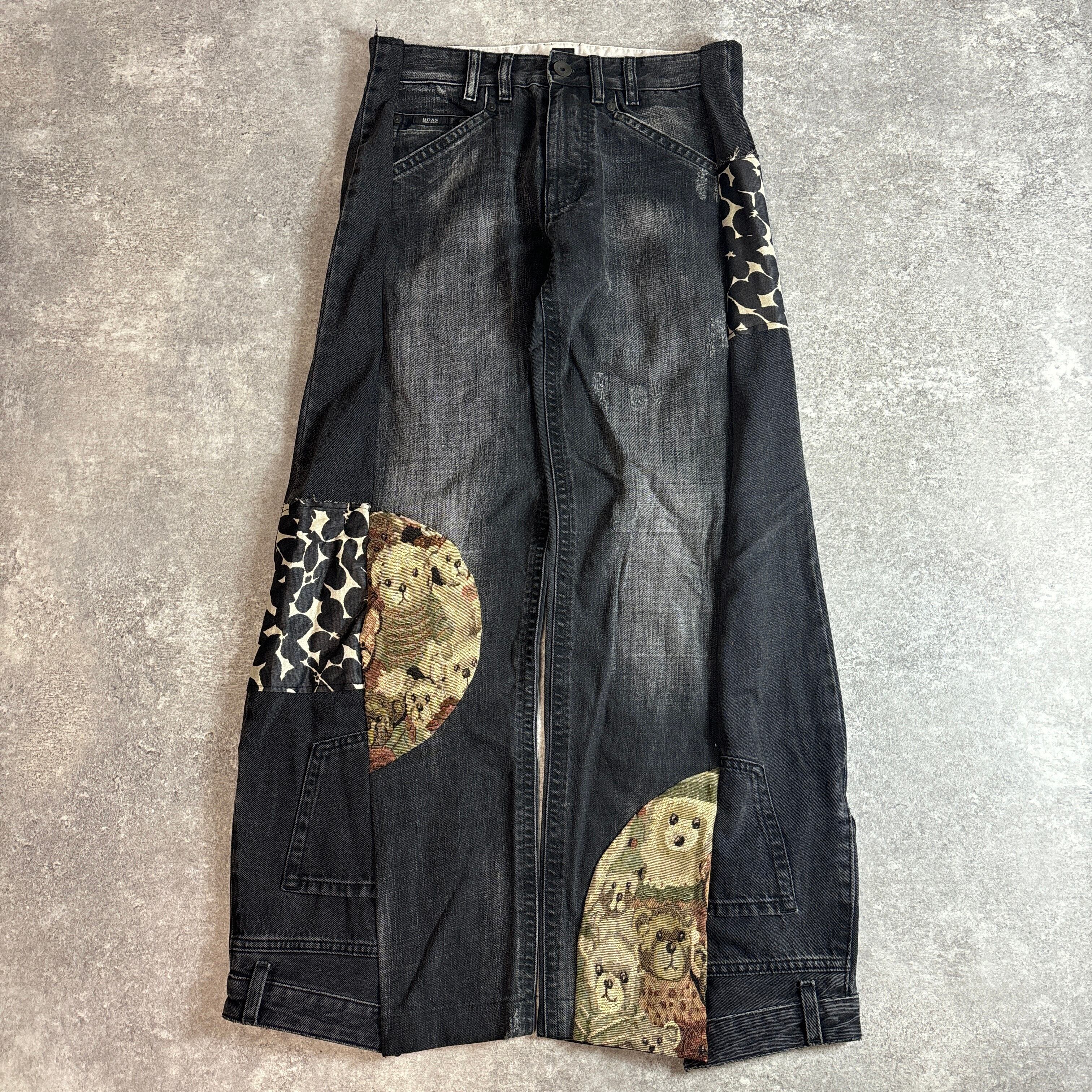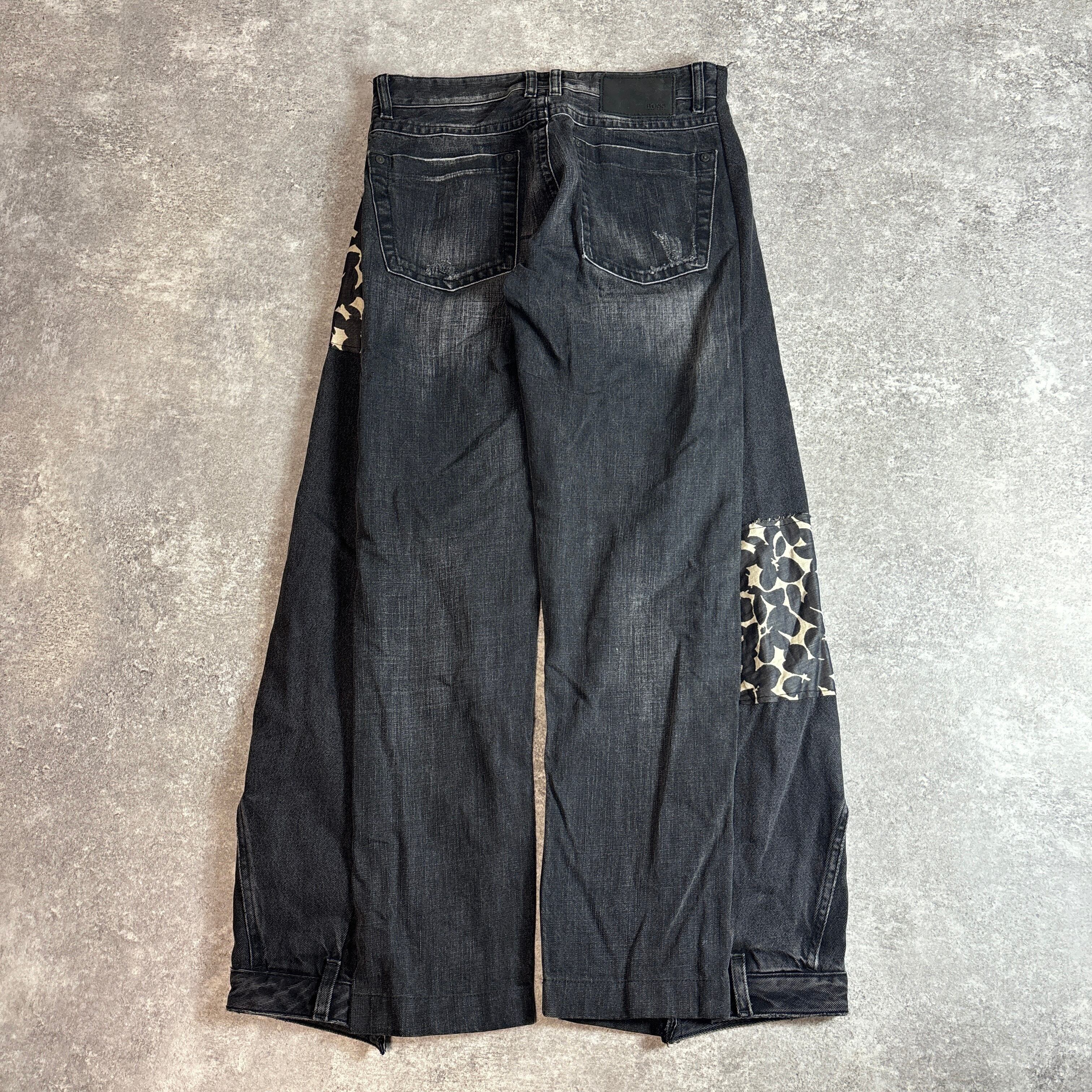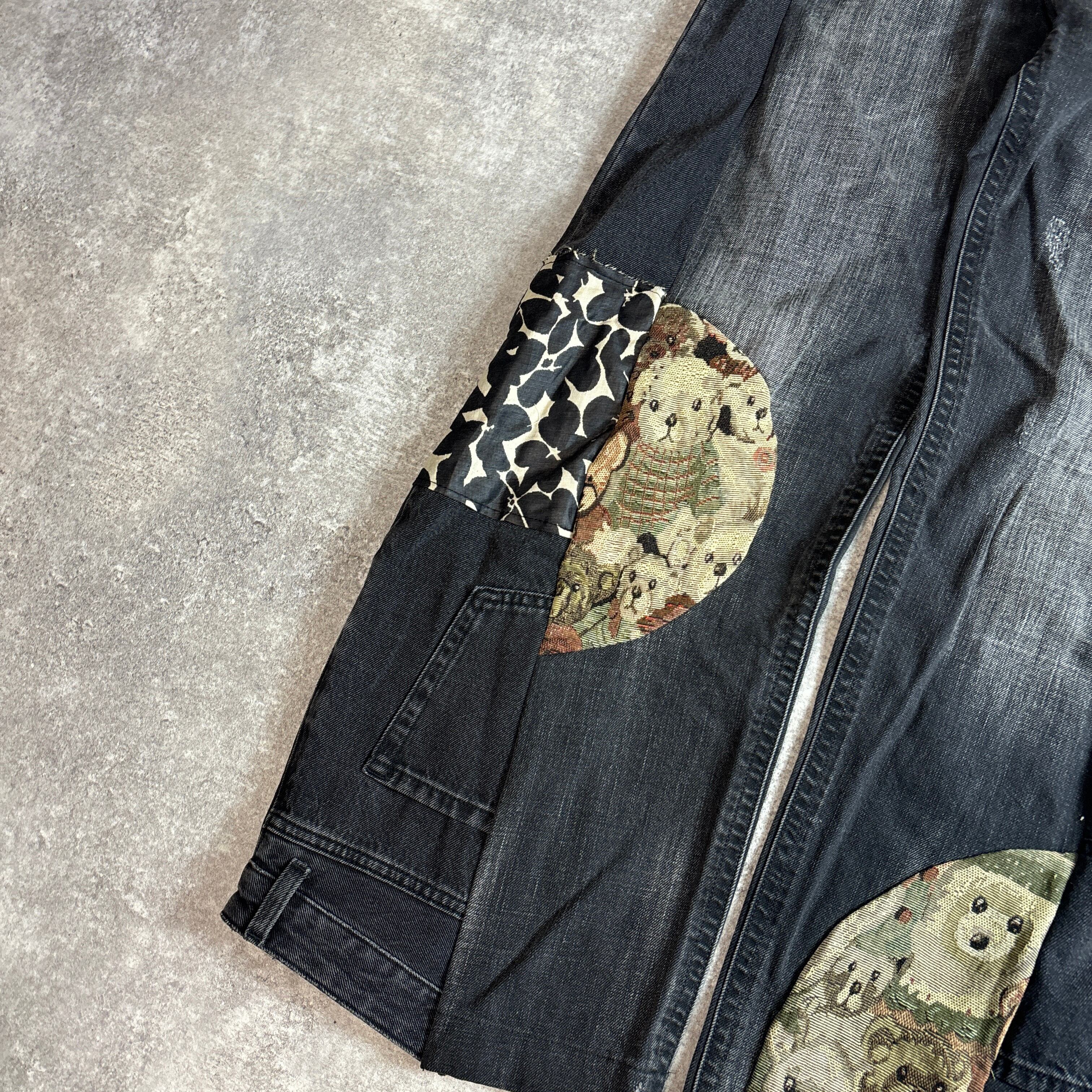黒デニムをベースに、左右で異なる柄を組み合わせた唯一無二のデザイン。