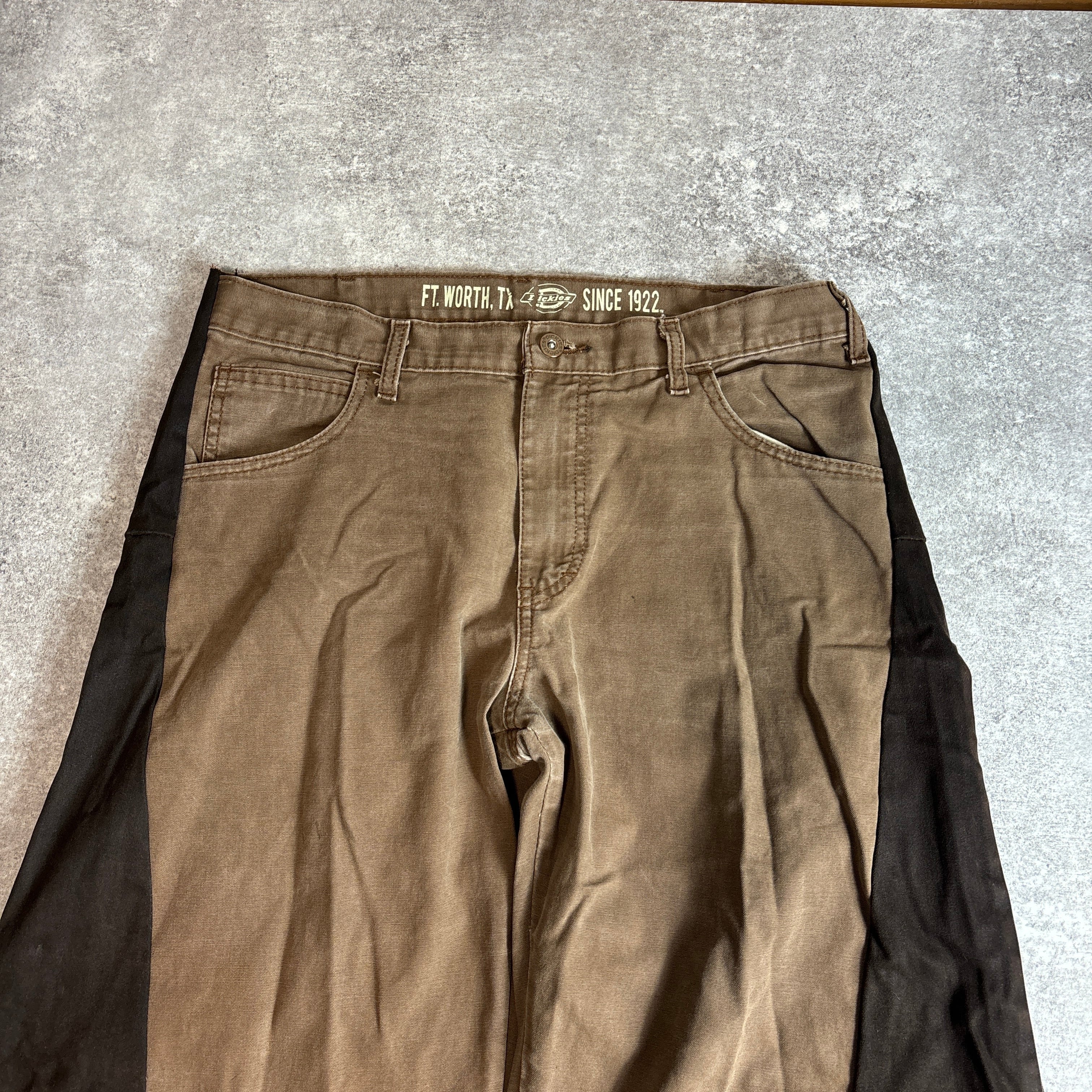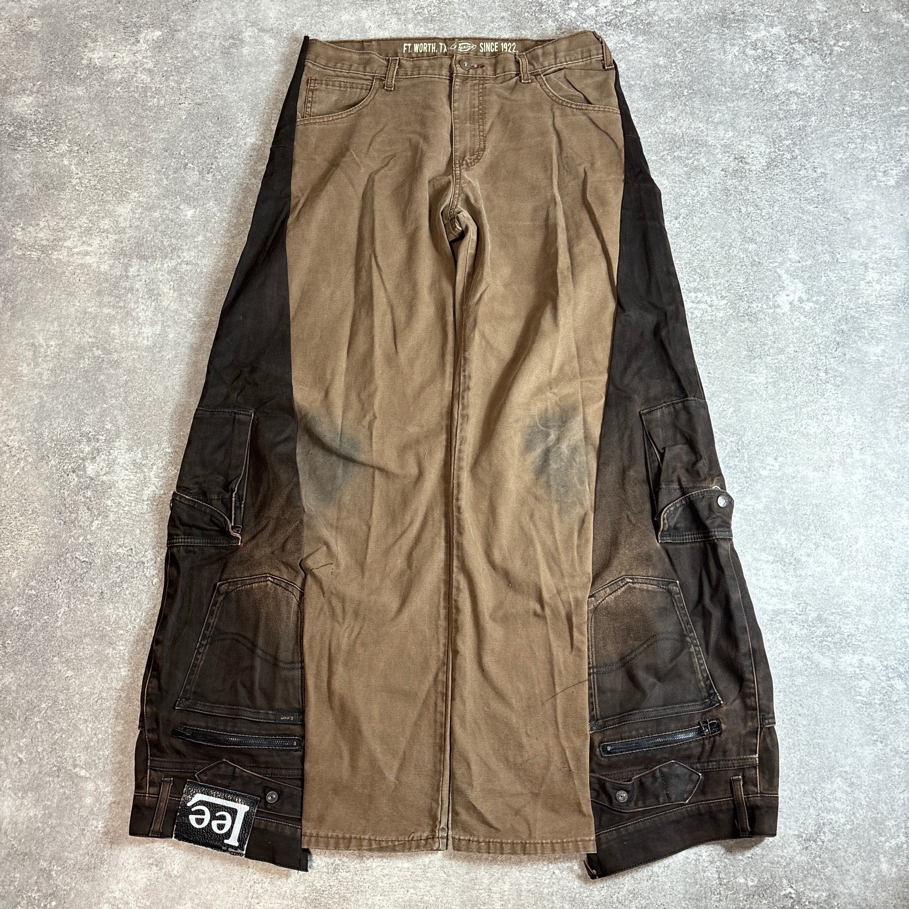 ブラウン×ブラックのツートーンカラーが印象的なリメイクパンツ。