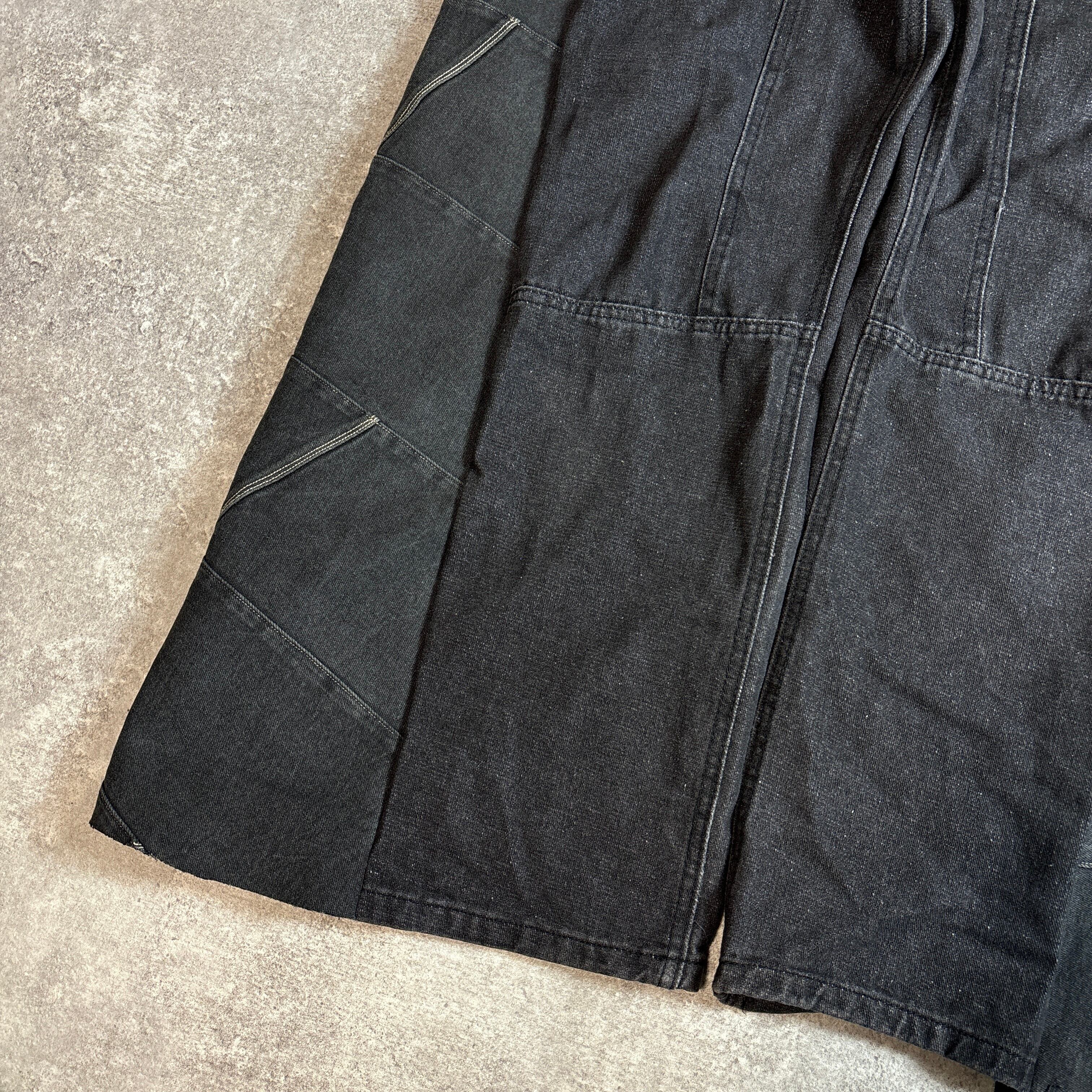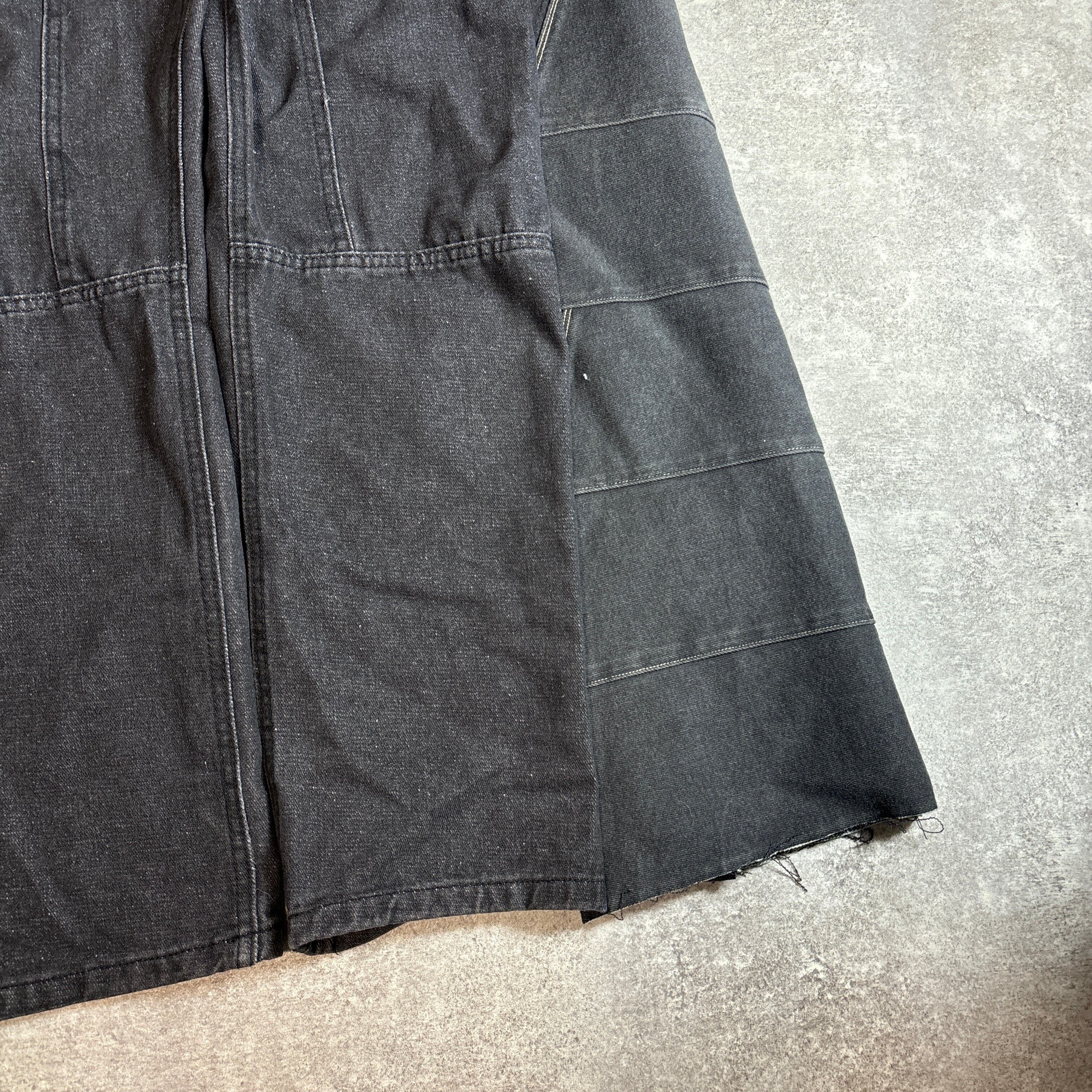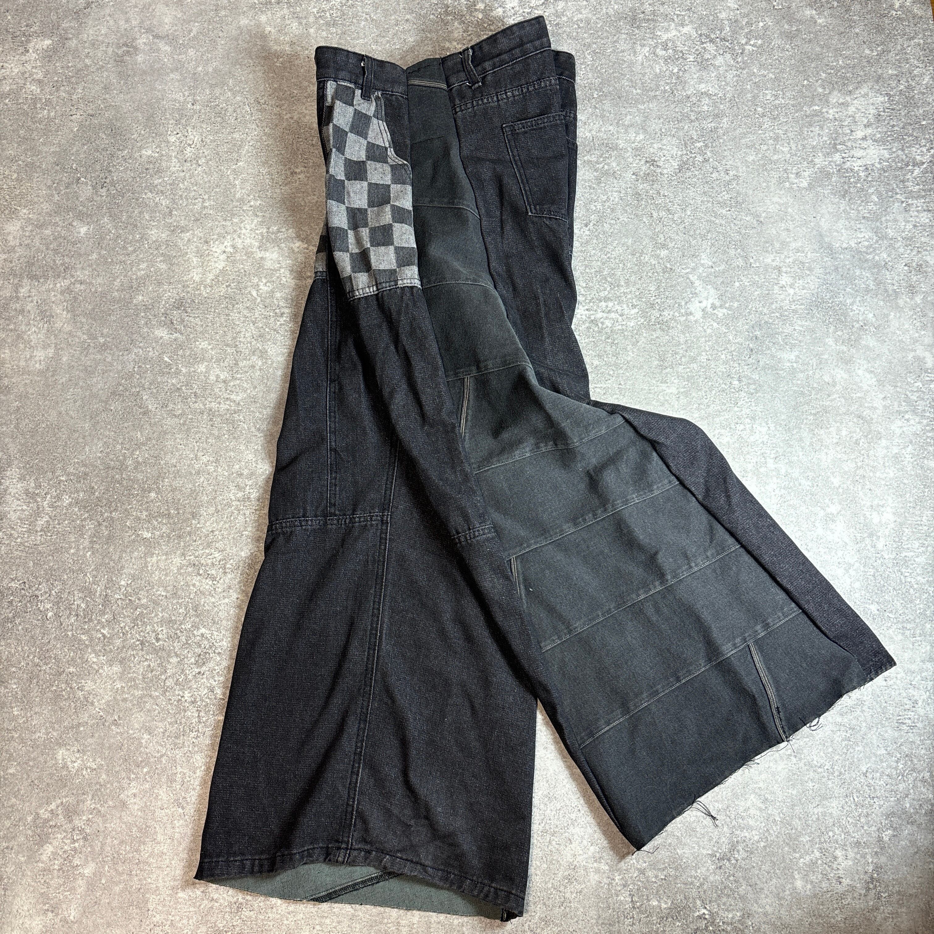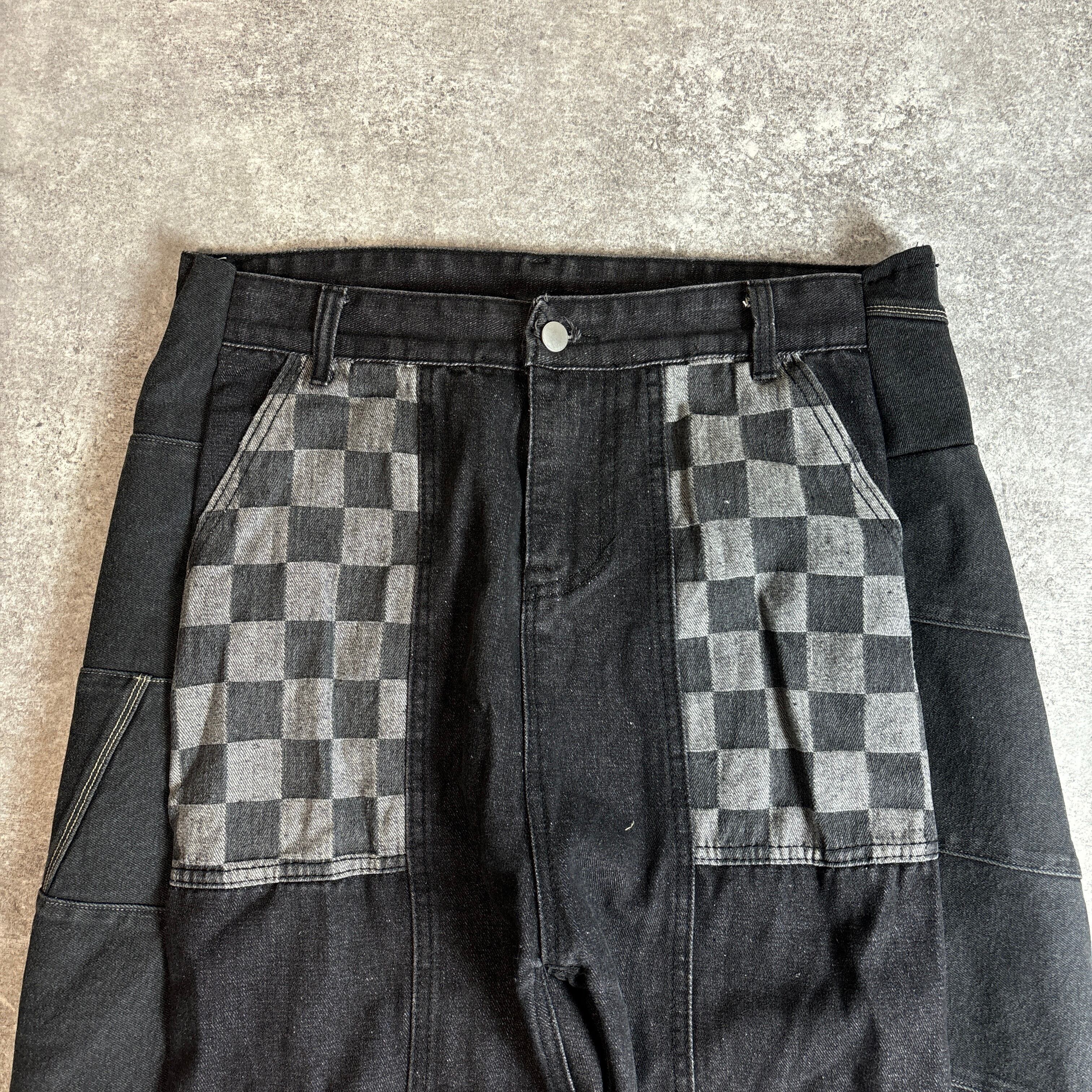 チェッカーフラッグ柄のポケットが目を引く、フルリメイクのブラックデニムパンツ。大胆な切り替えデザインと立体感のあるシルエットが個性的で、ストリートにも古着系コーデにもマッチします。