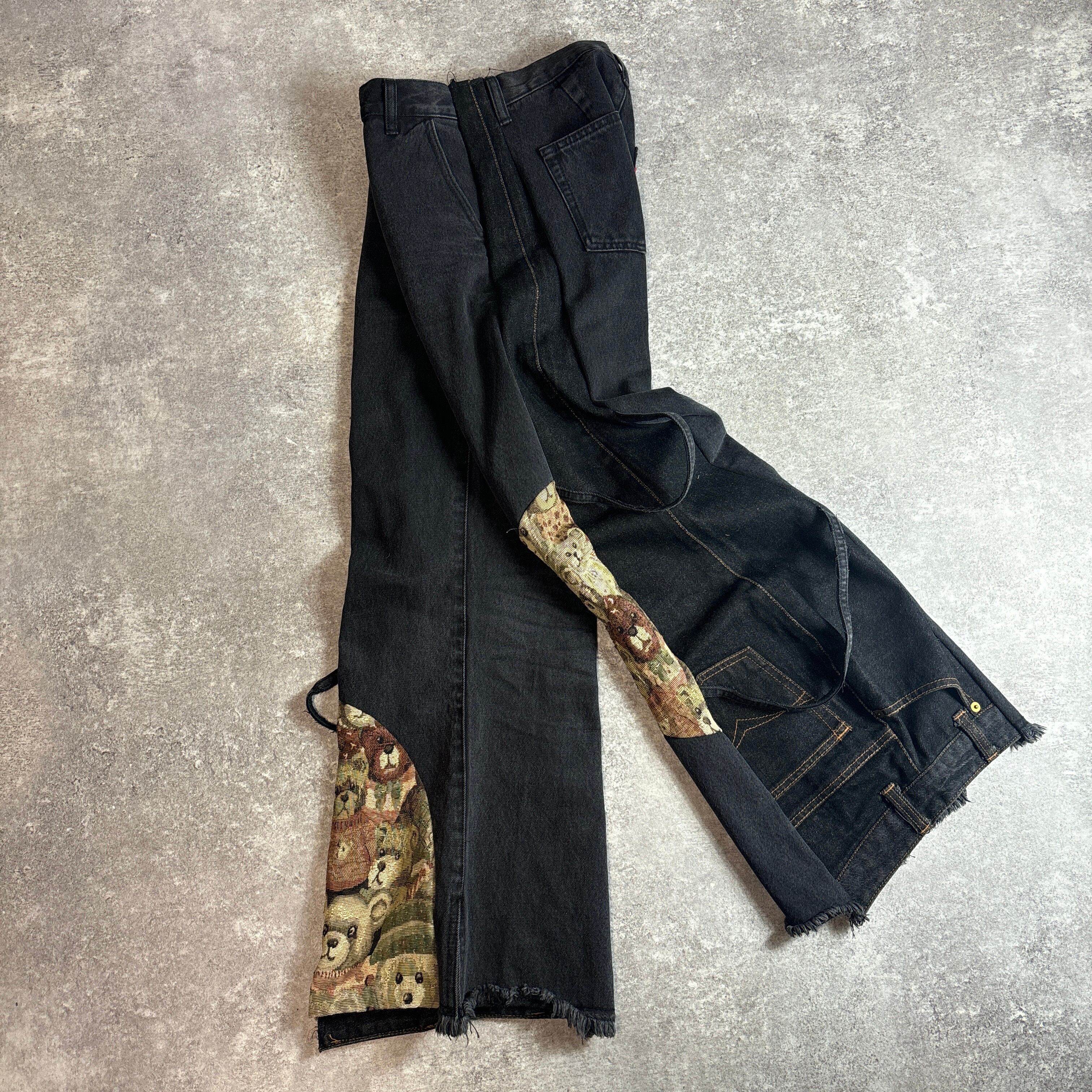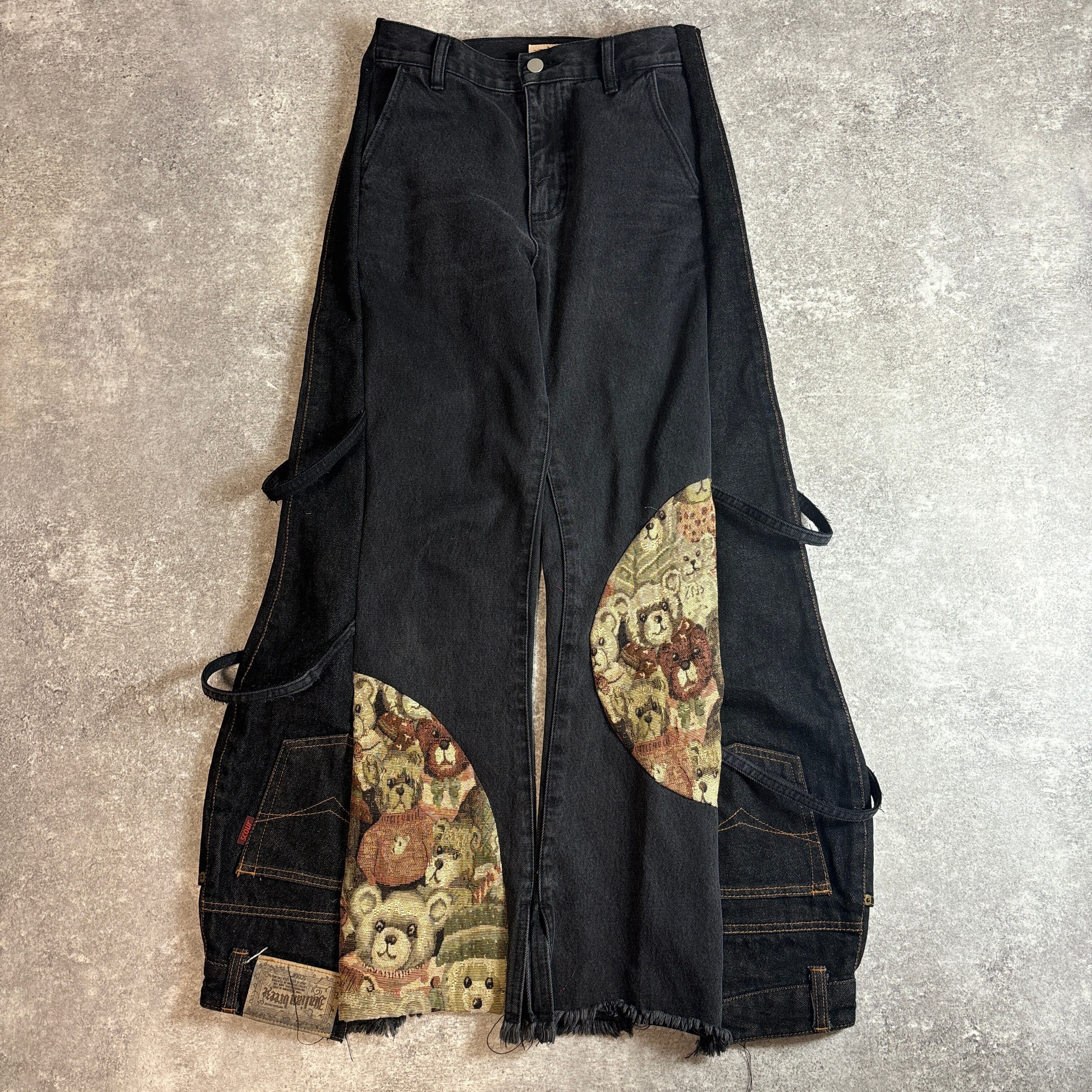 古着デニムを大胆にリメイク!くま柄のジャガード織り生地を大胆に切り替えた、存在感たっぷりの一本です。