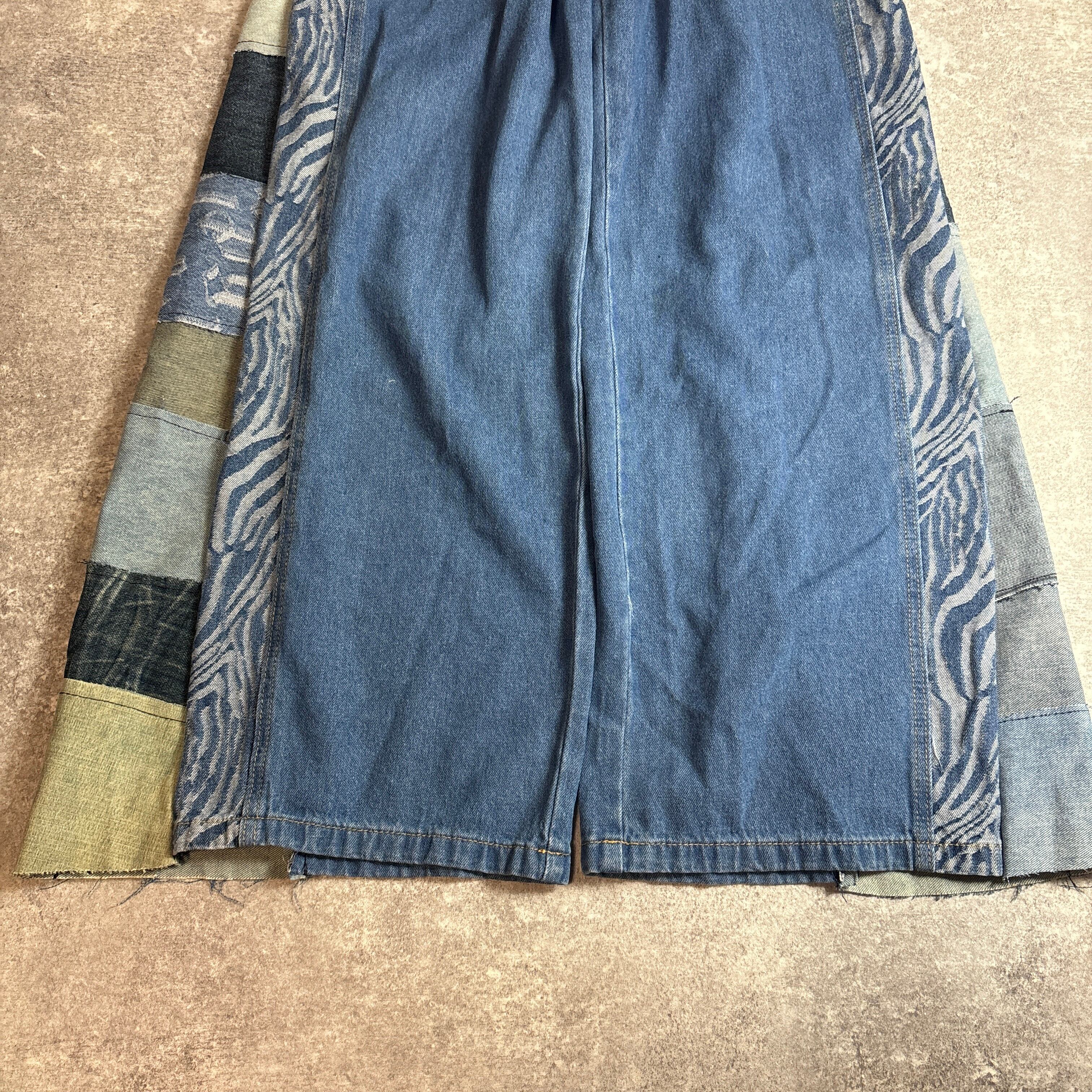 デニムパンツをベースに、ゼブラ柄のジャガード生地と様々な風合いのデニム・ファブリックを組み合わせてリメイクした、唯一無二のワイドパンツです。