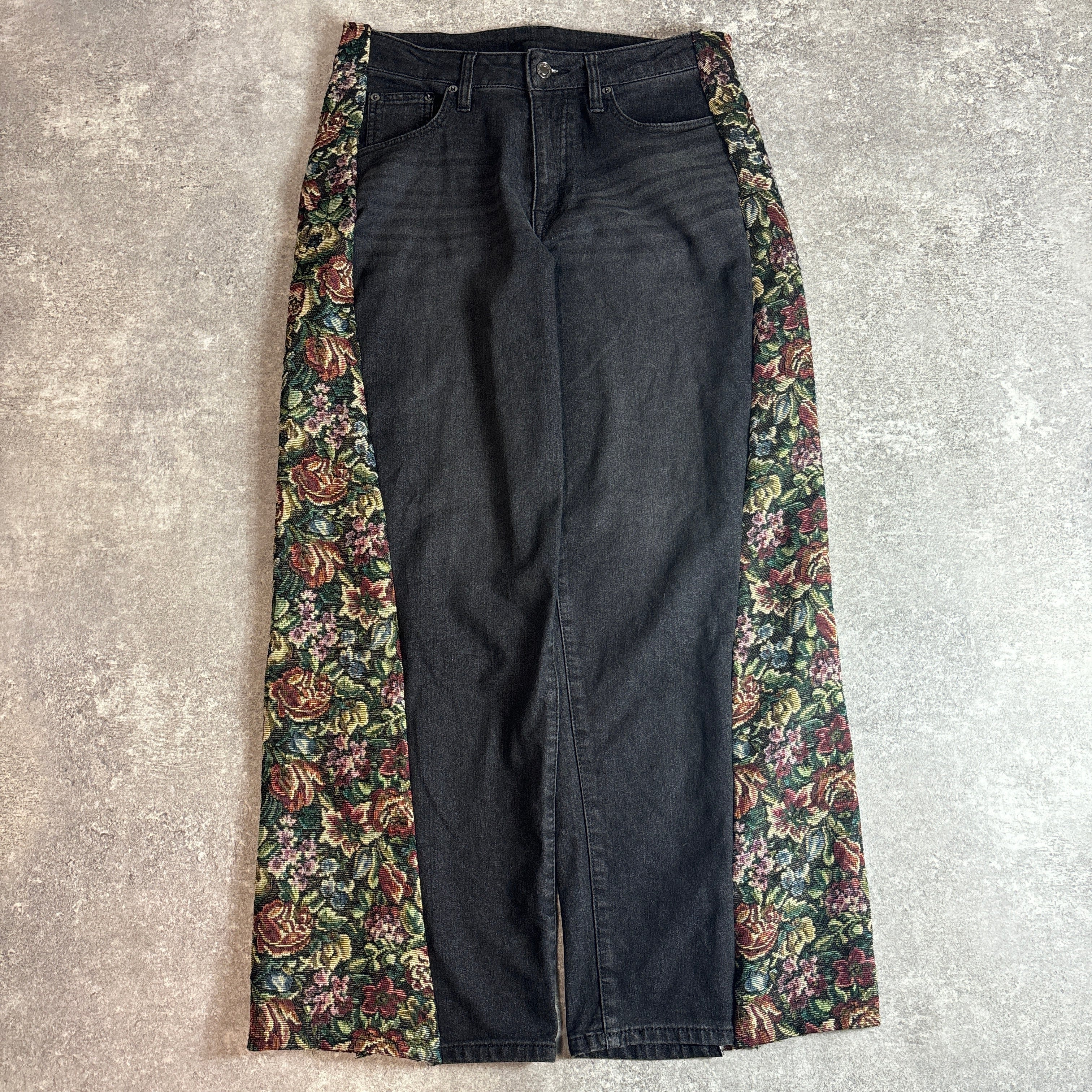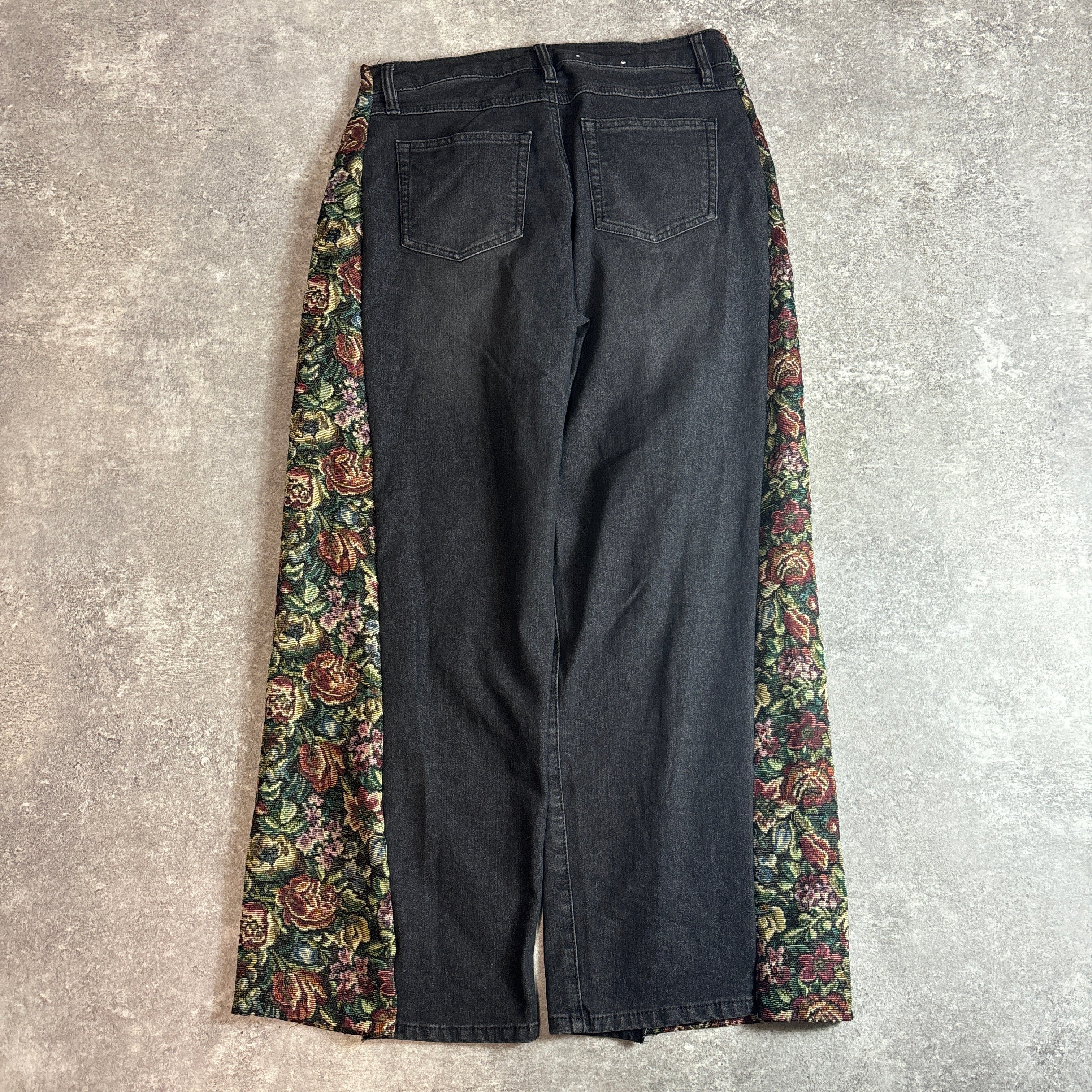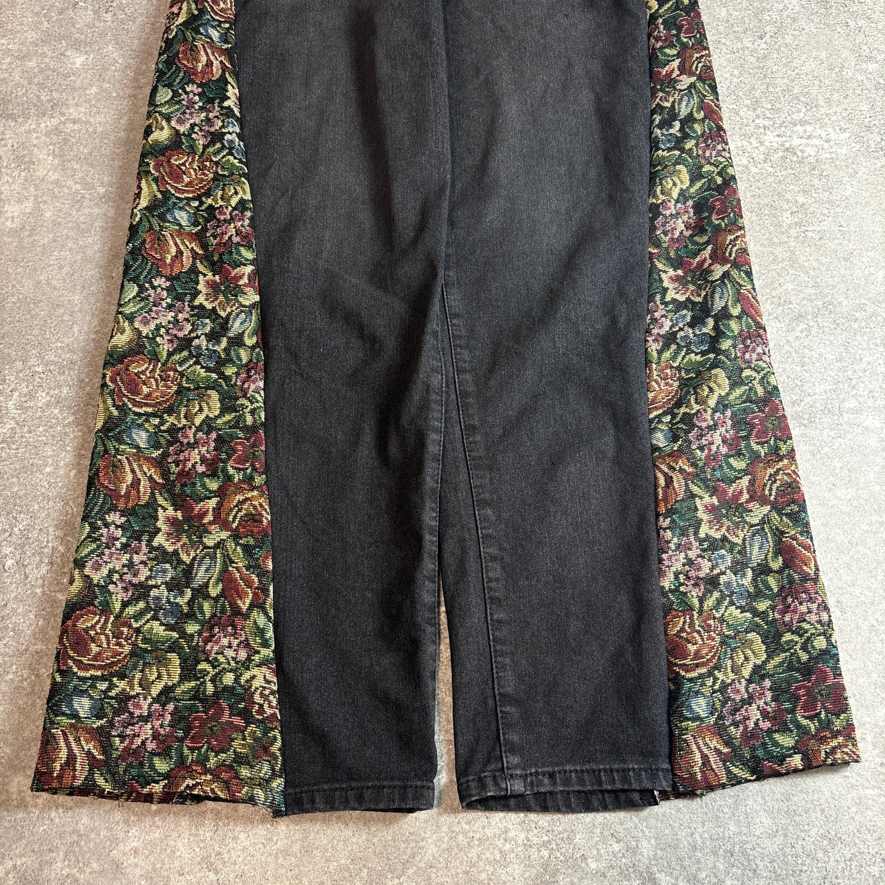 ブラックデニムに、サイドを彩るアンティーク調の花柄ジャガード生地を使用したフレアパンツ。