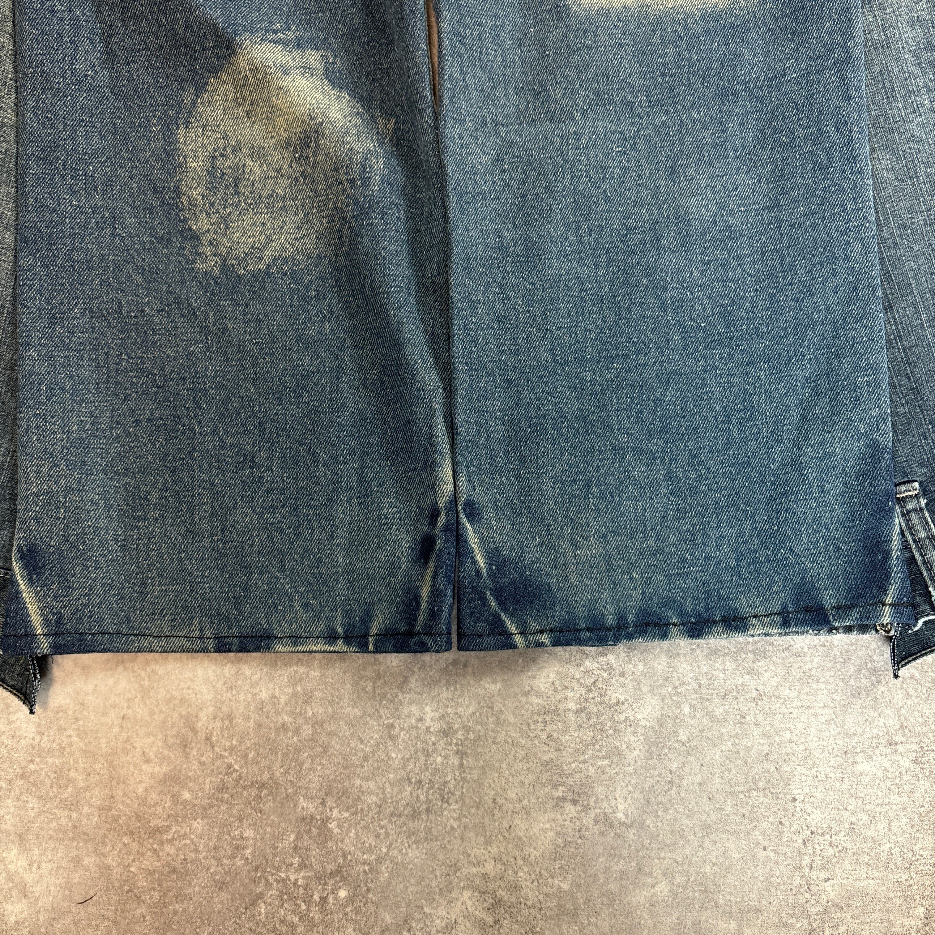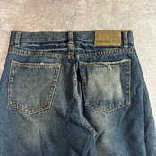 複数のデニムを再構築し、あえて異なる色落ち・ダメージを組み合わせた一点物デザイン。