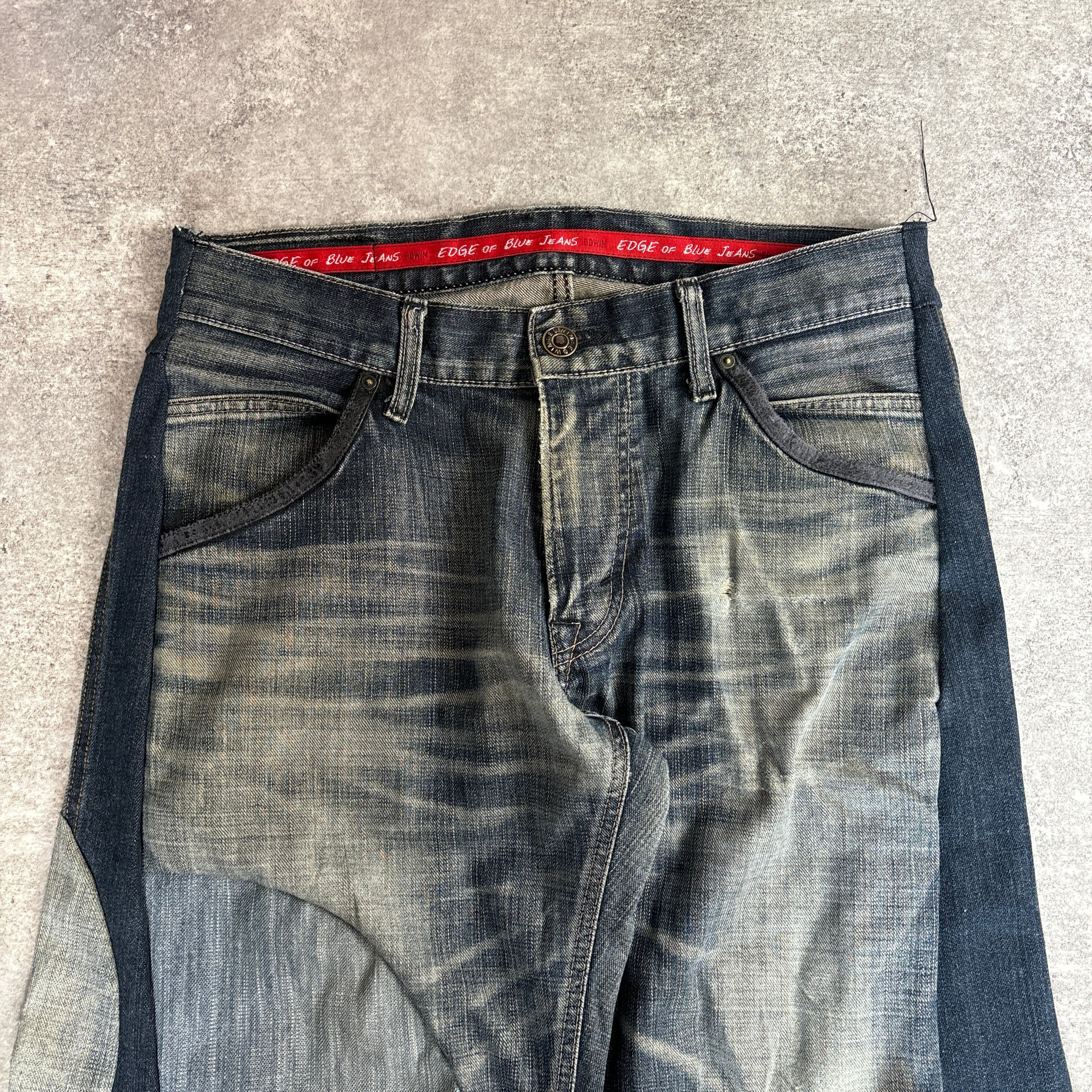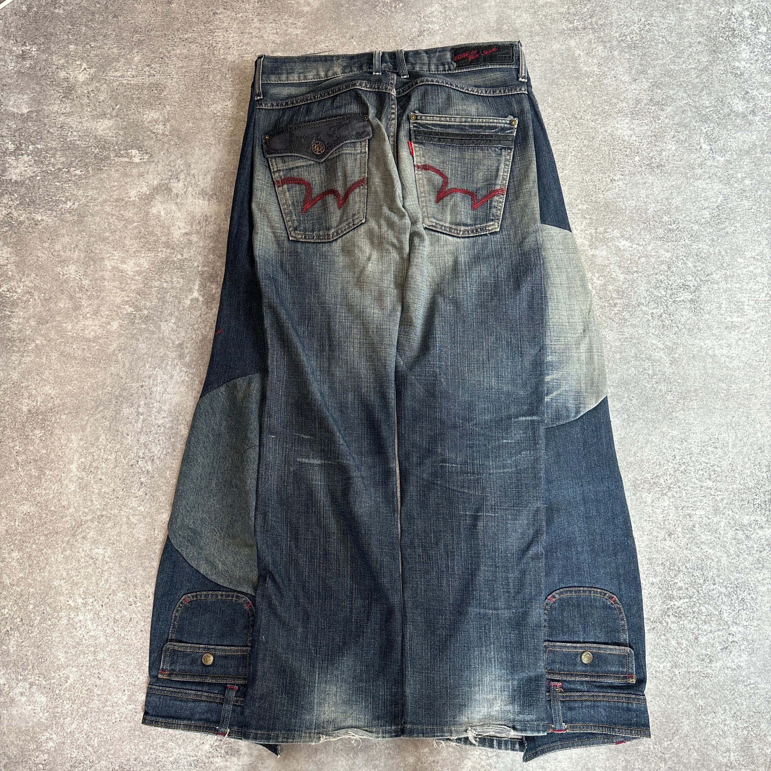 複数本のジーンズを組み合わせ、円形の切り替えやダメージ部分をアクセントに仕上げました。
