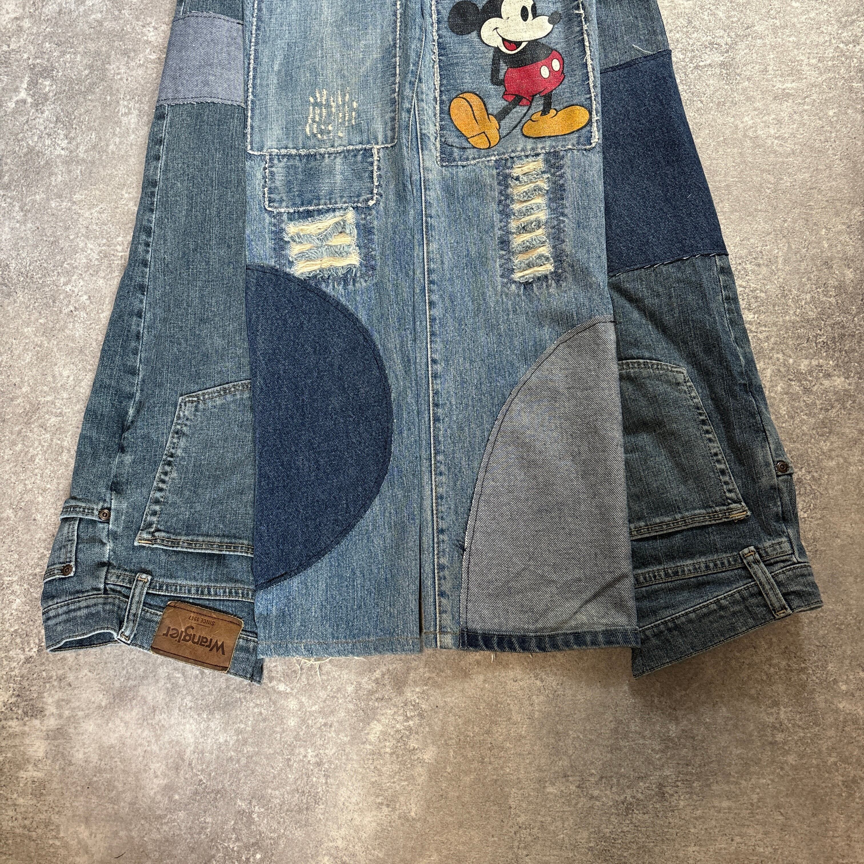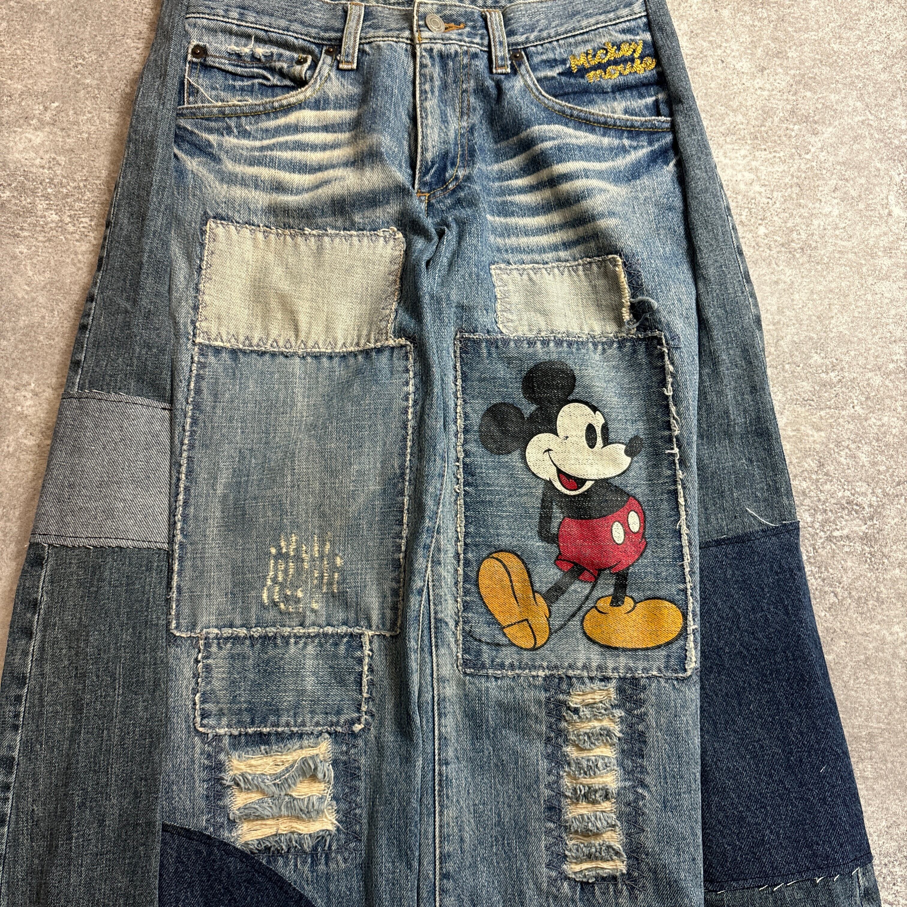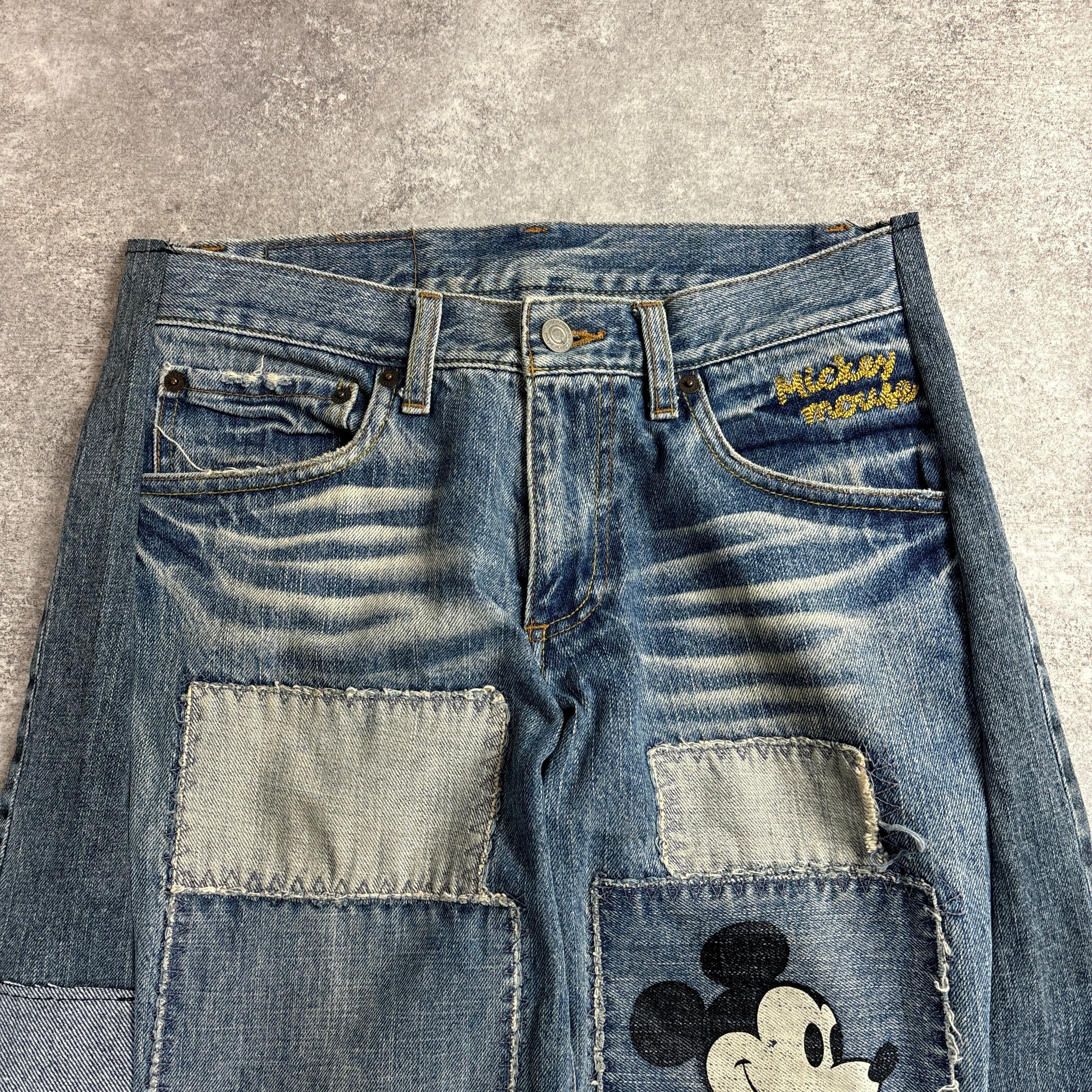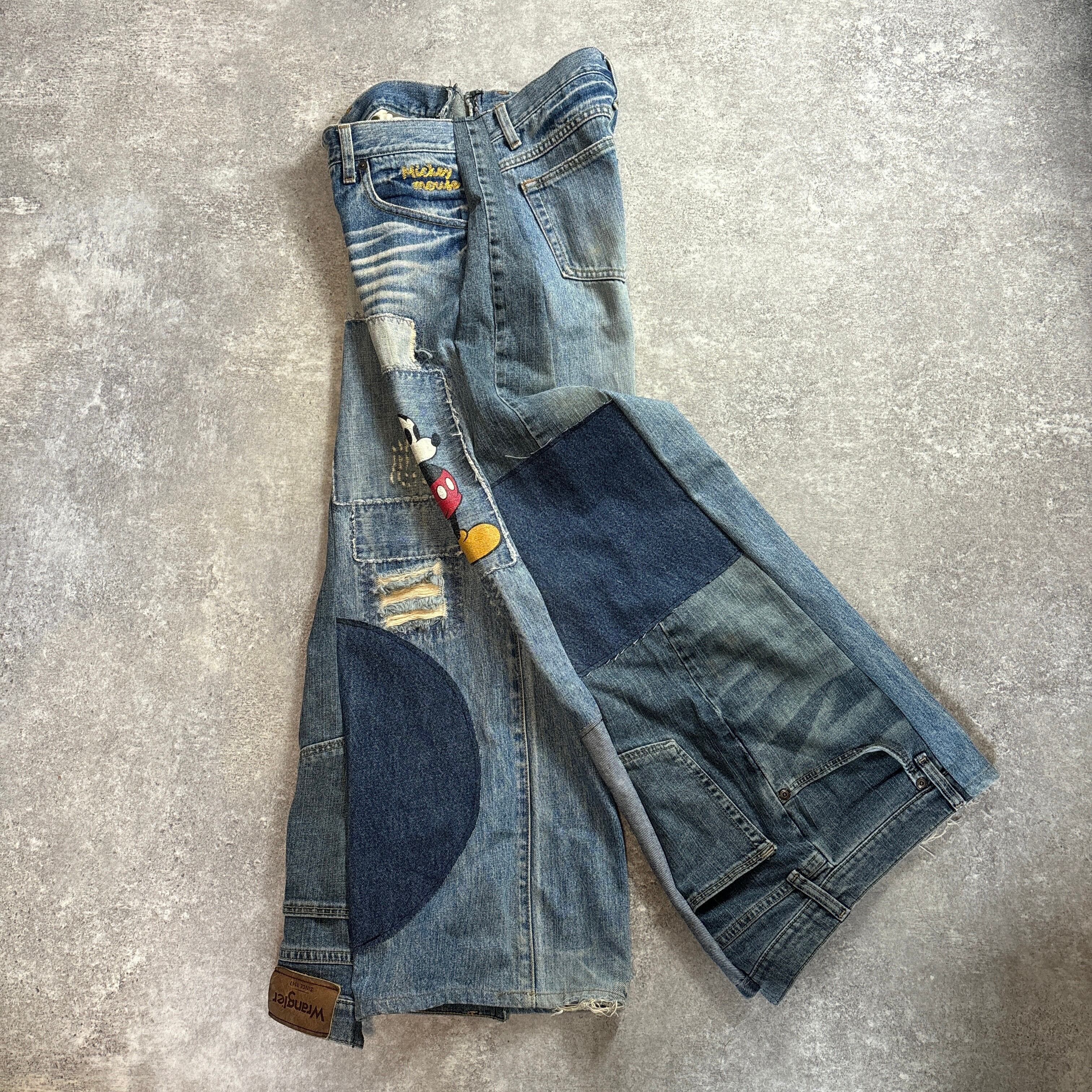 複数のジーンズを再構築し、ミッキーのワッペンや大胆なパッチワーク、ダメージ加工を施した、こだわりの詰まった一着です。