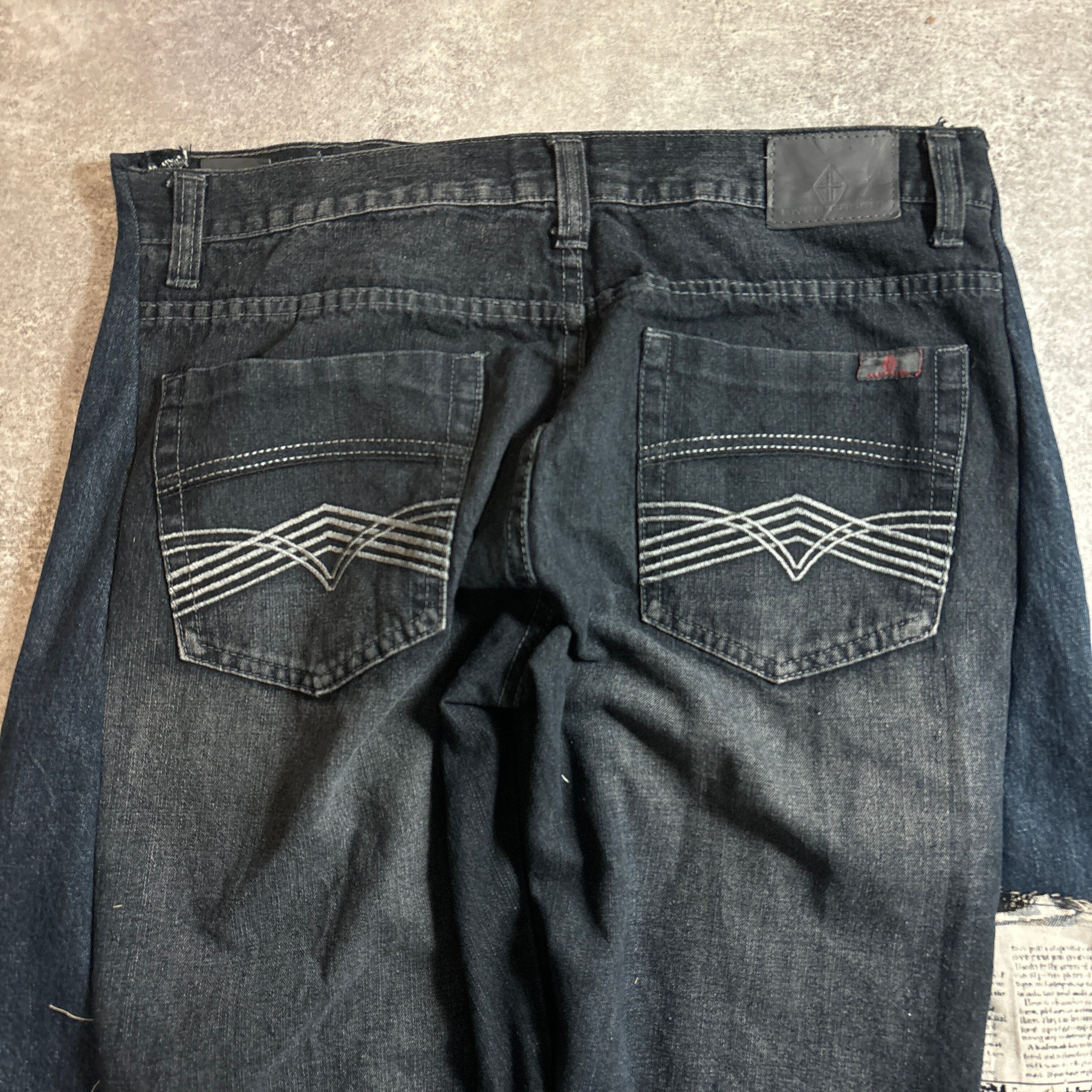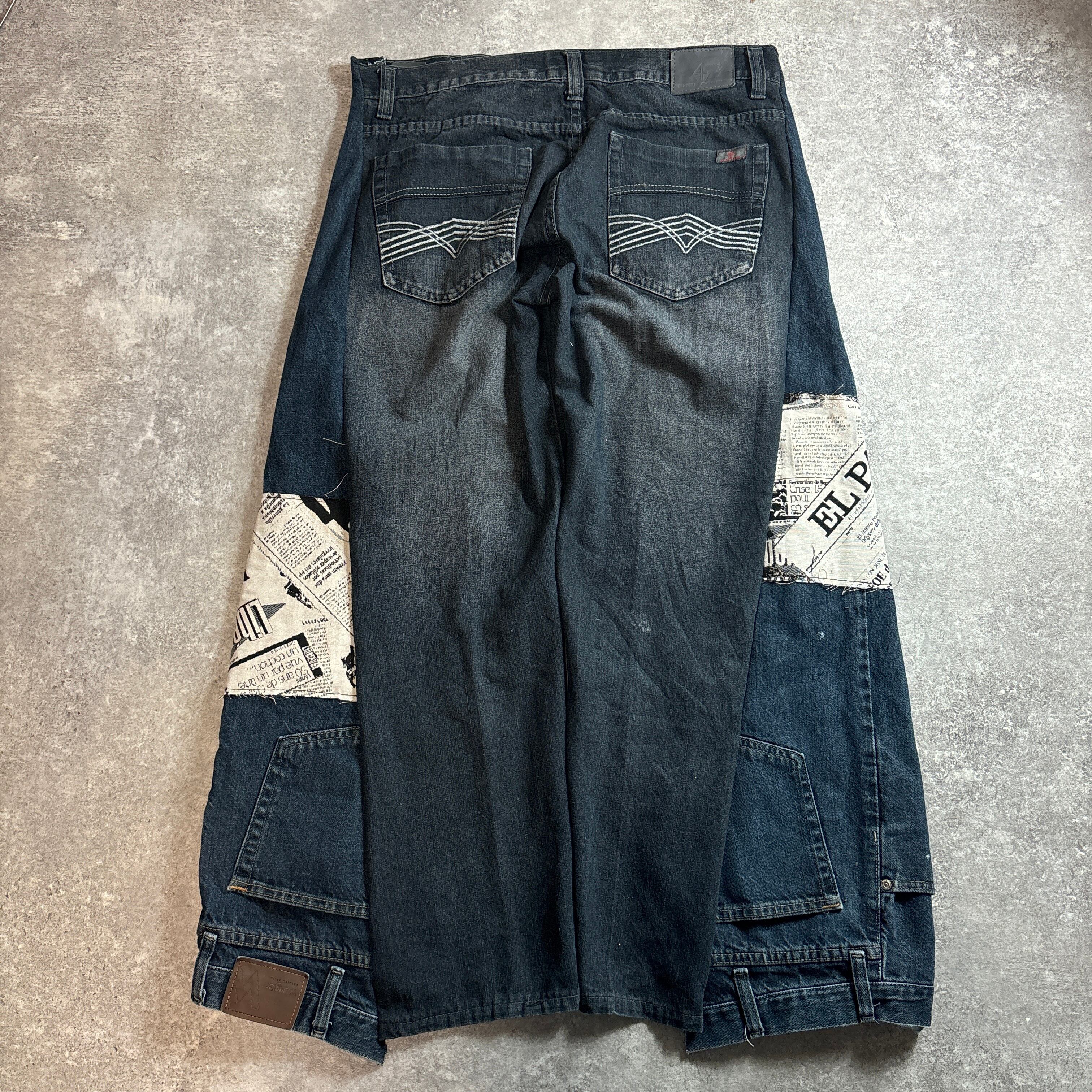 解体したデニムパンツをベースに、新聞柄・黒ベースの花柄・ブラックデニム・ポケットなど、さまざまな異素材をパッチワーク。