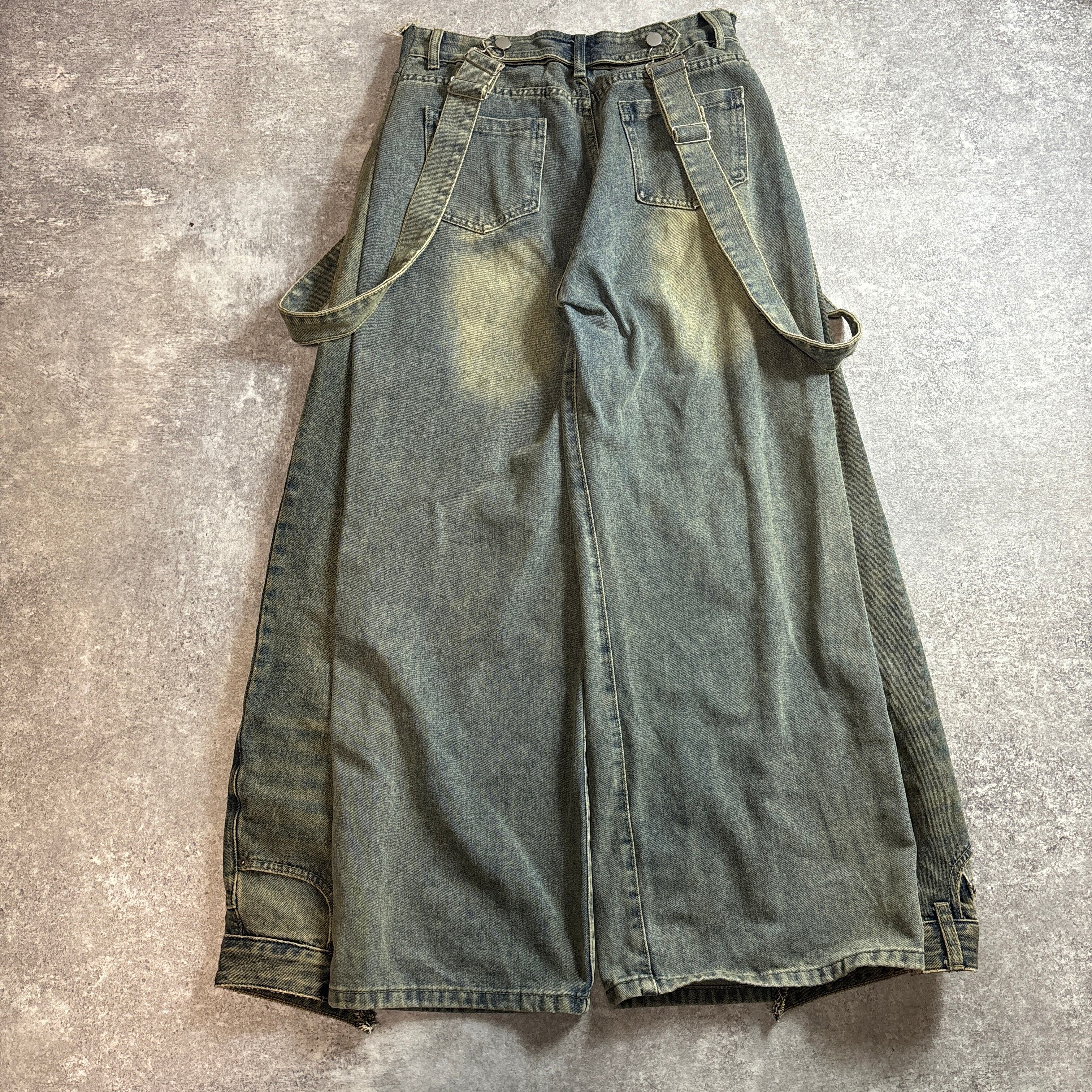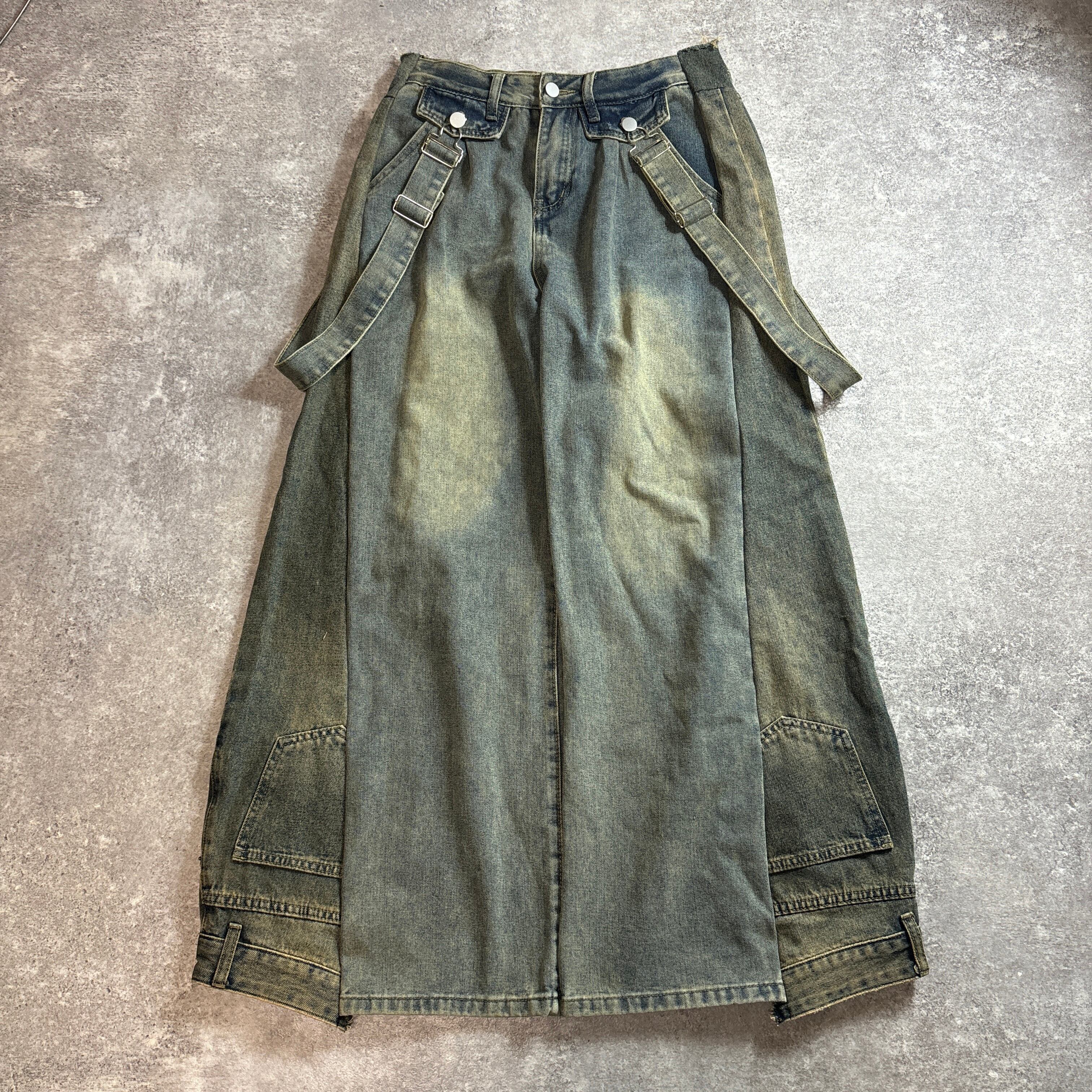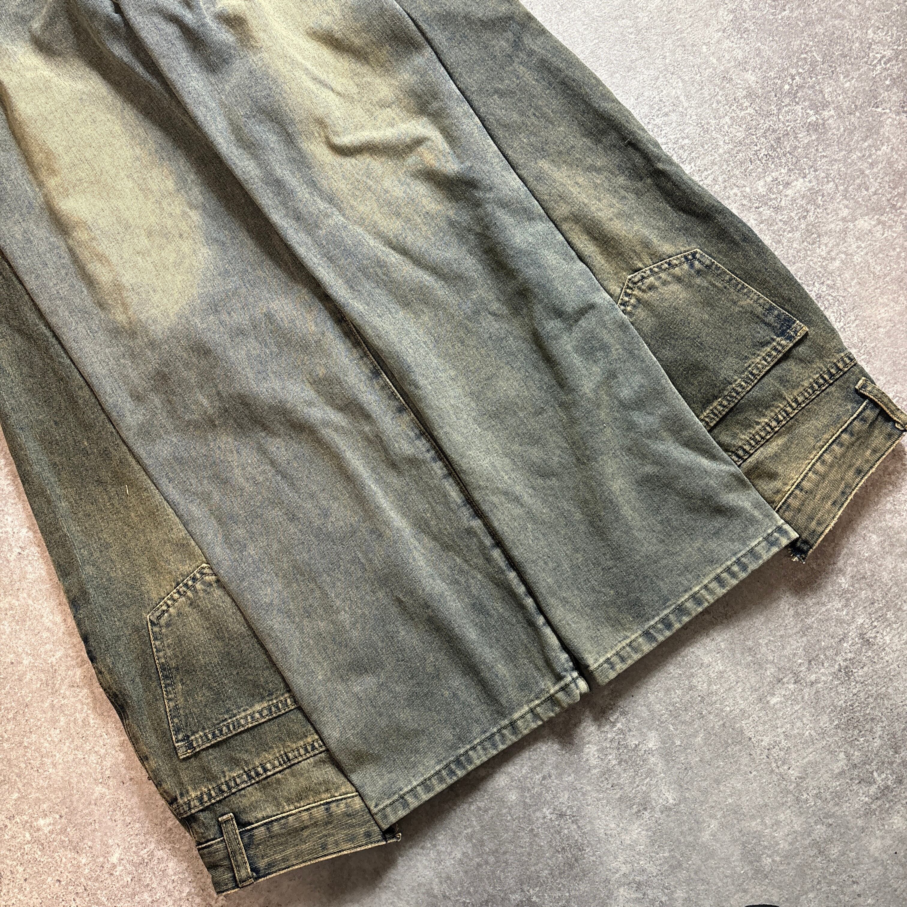 ユニークなシルエットが魅力のワイドデニムパンツ。