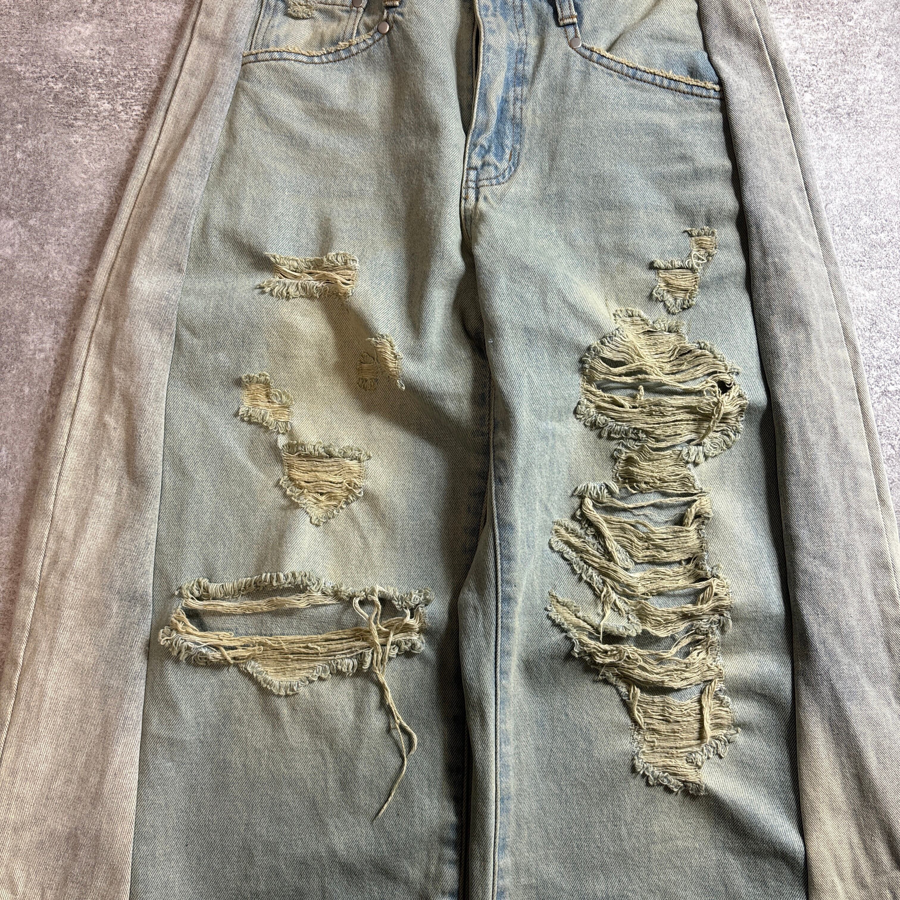 ヴィンテージ感漂うダメージデニムに、異素材デニムを大胆にドッキングした一点モノのリメイクデニムです。