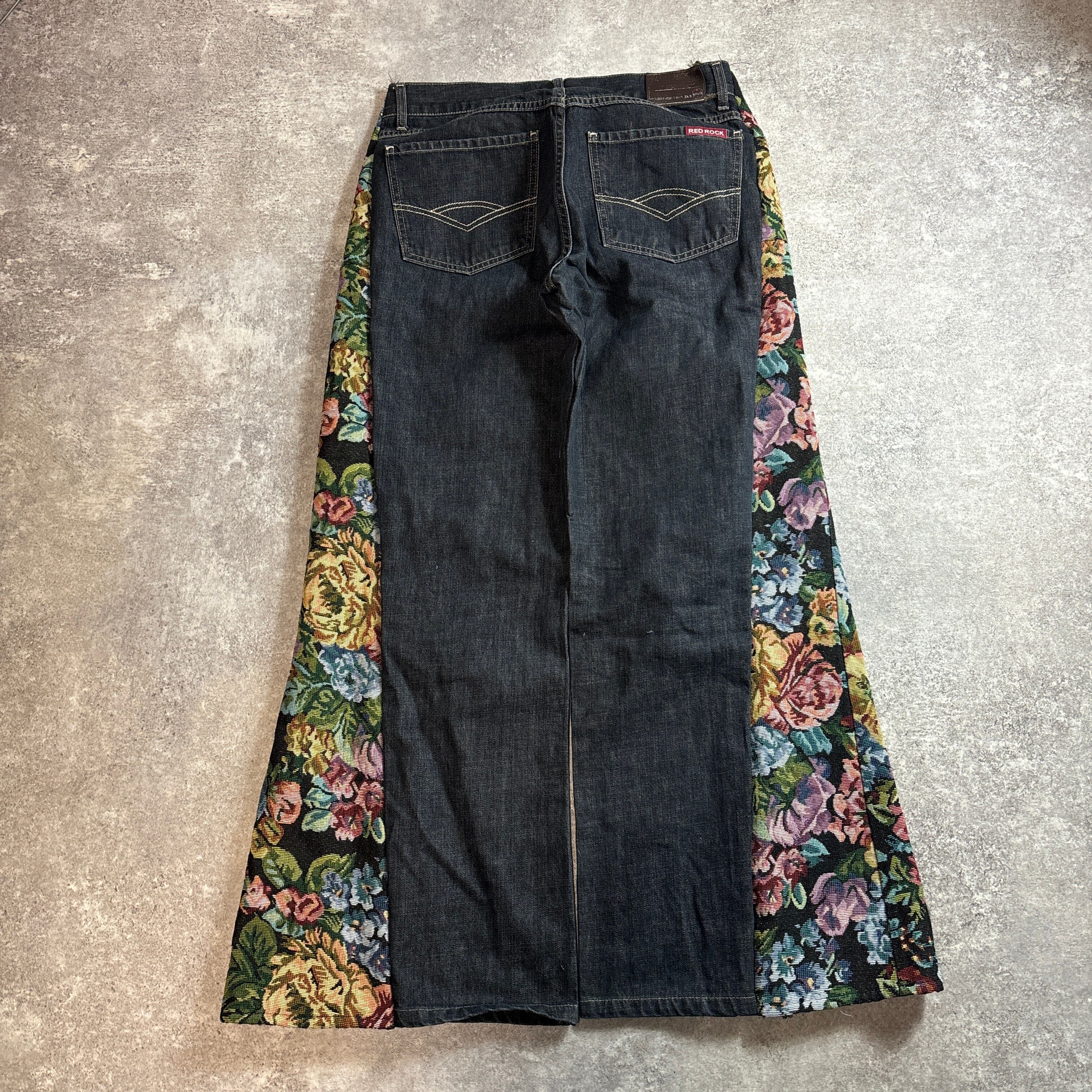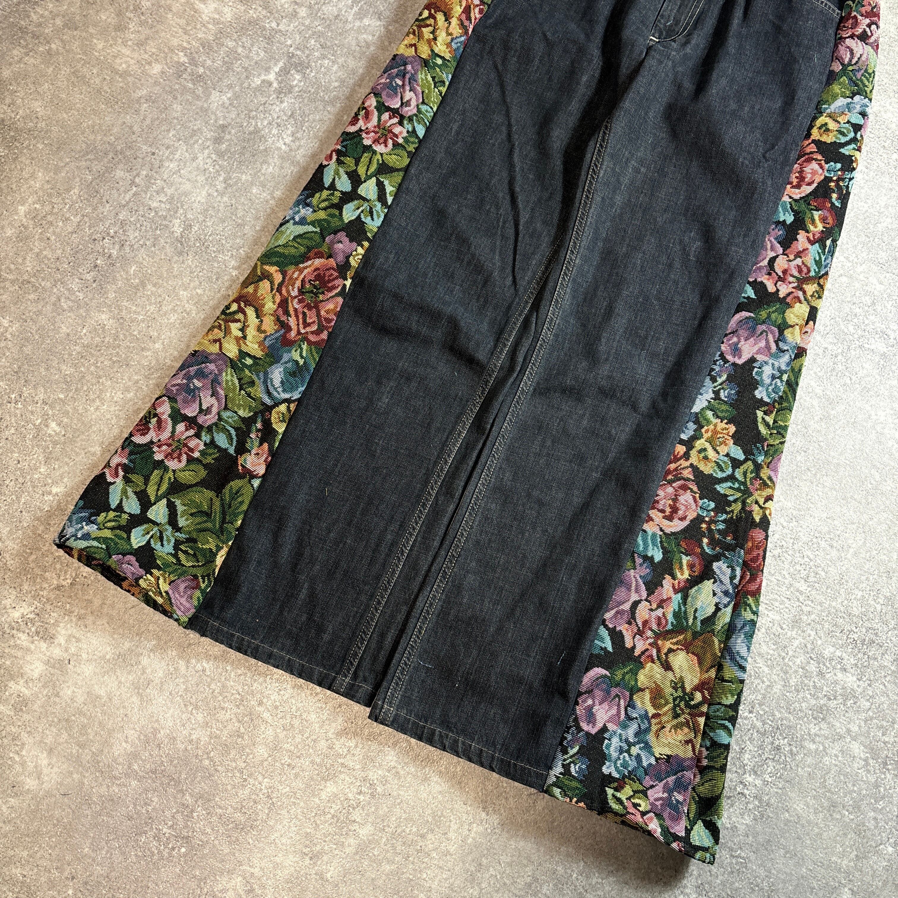 デニムパンツをベースに、両サイドへフラワー柄のゴブラン生地を切り替えたリメイクデザインパンツです。