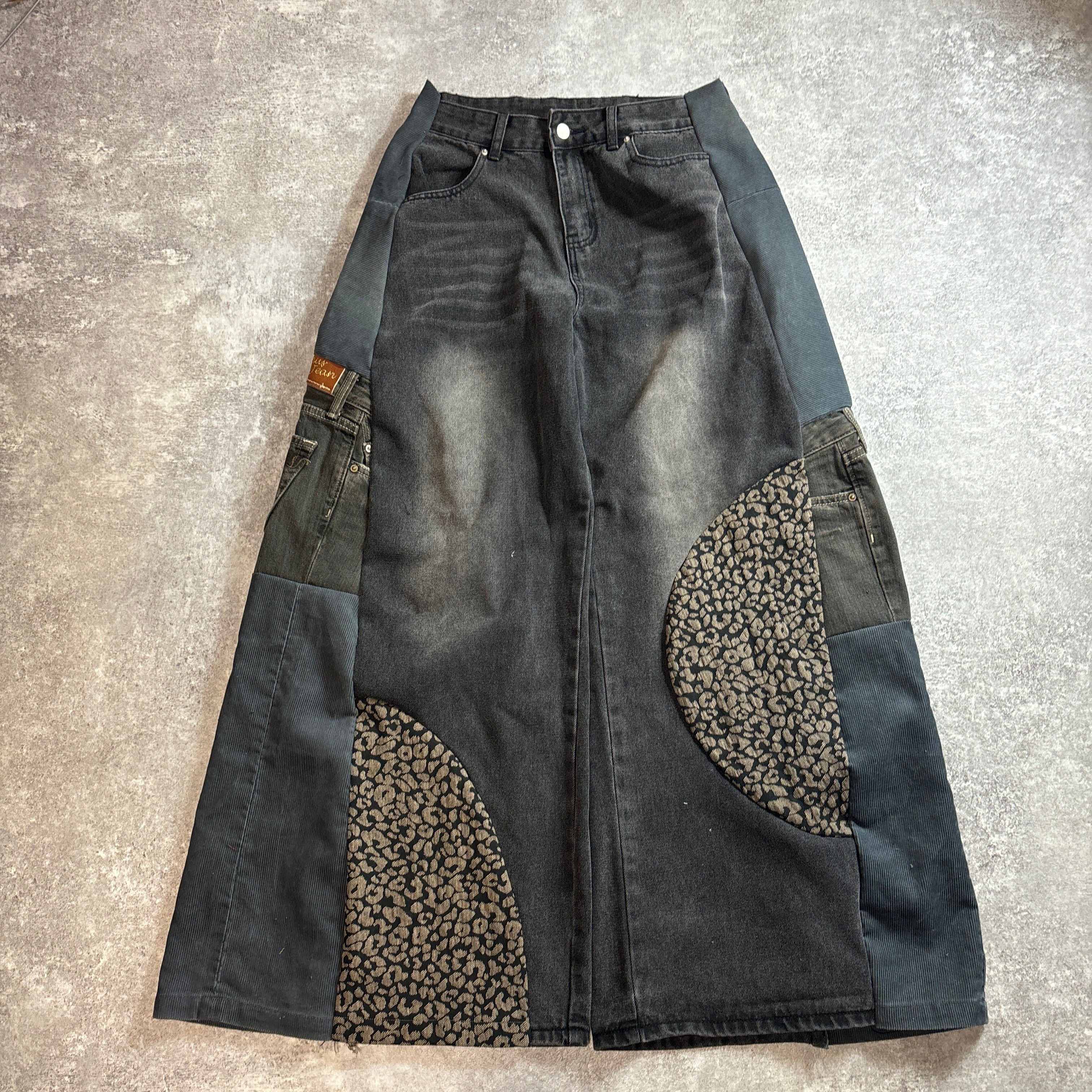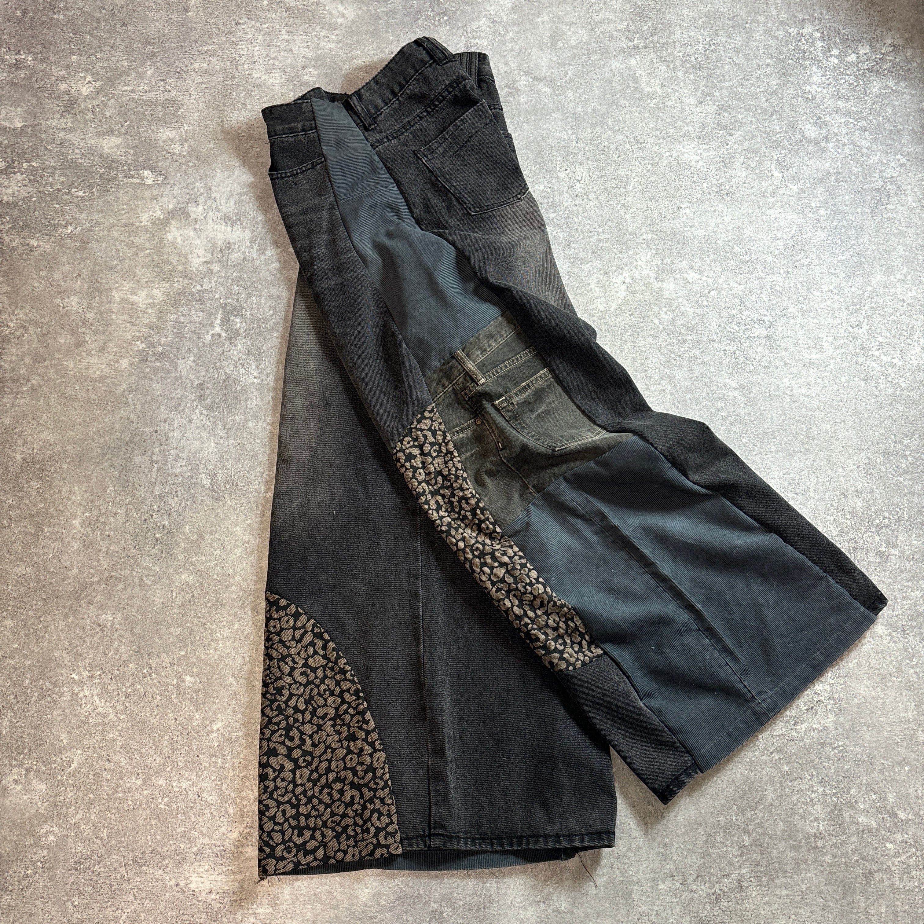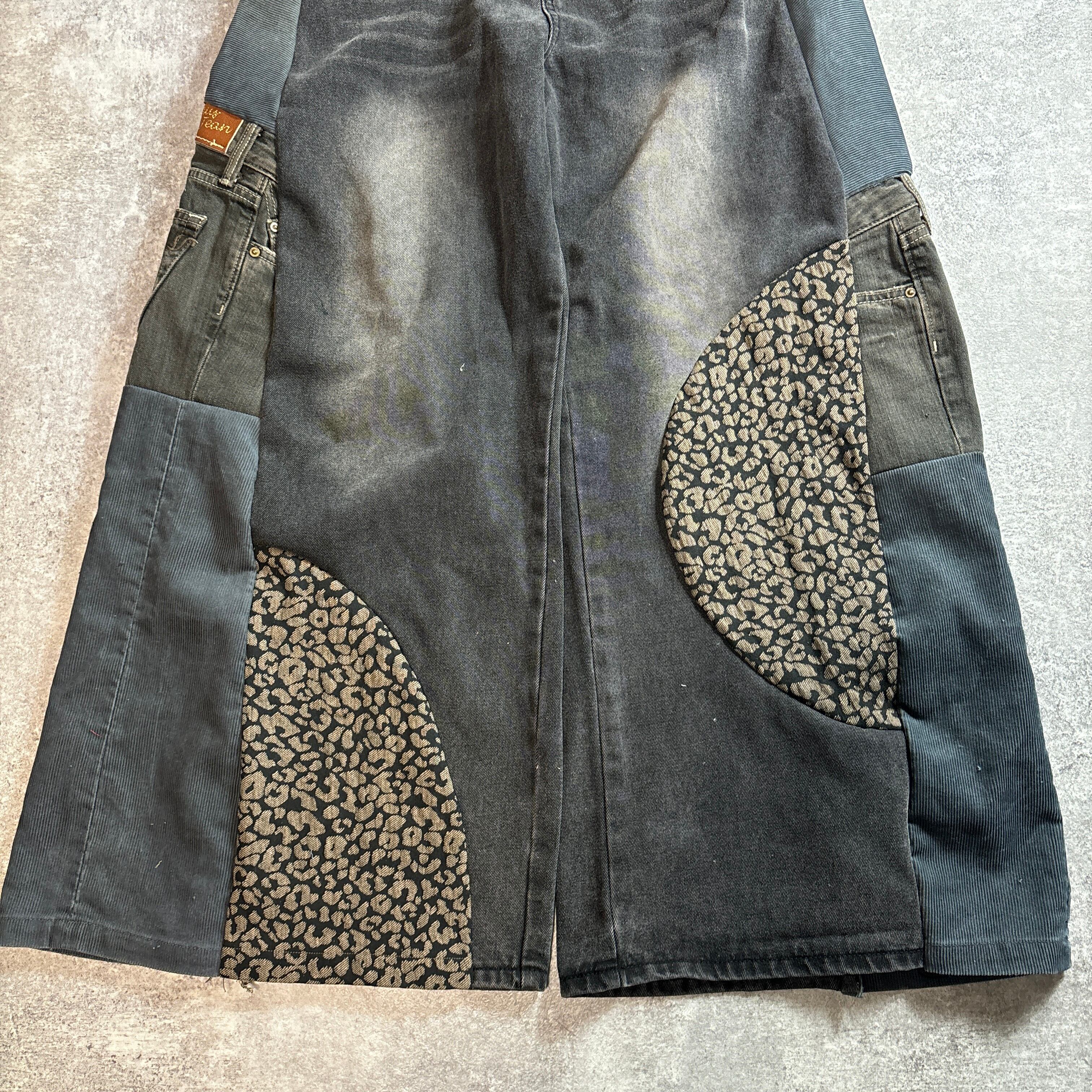 ブラックデニムをベースに、サイドと一部にレオパード柄生地・異素材デニムを切り替えたリメイクデザインパンツです。