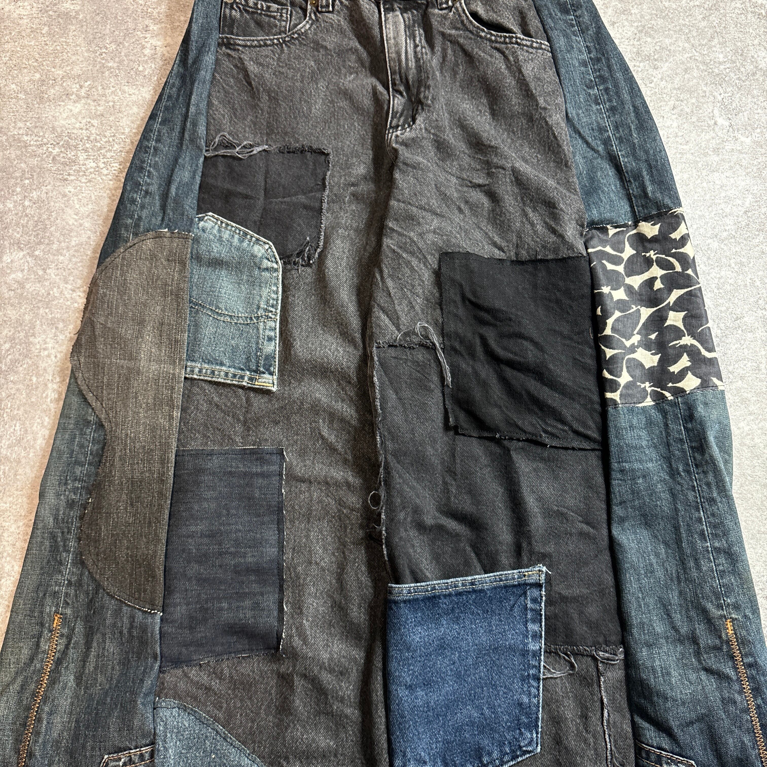 ブラックデニムをベースに、濃淡の異なるデニムや異素材、柄生地を組み合わせて再構築したリメイクデザインパンツです。