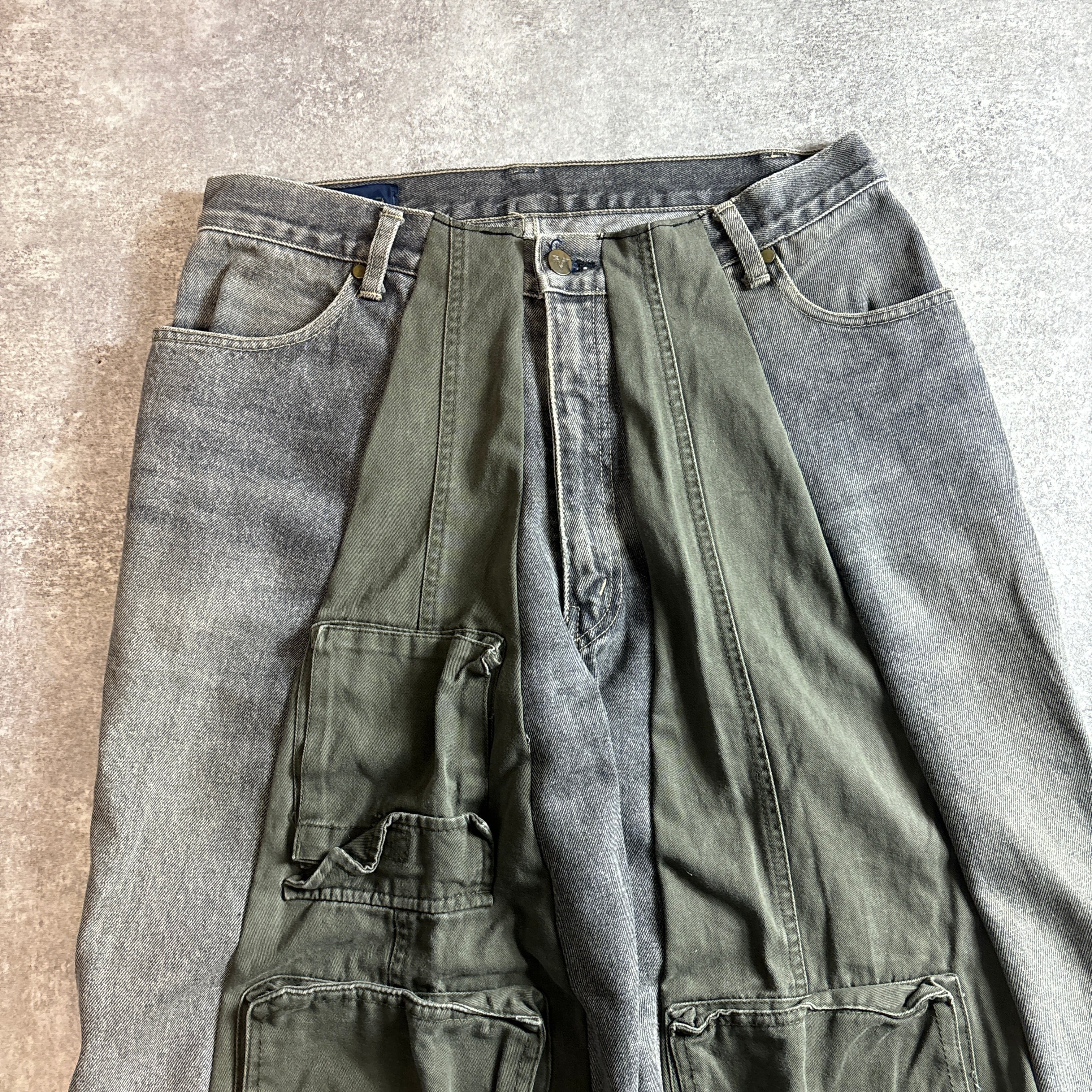カーキのミリタリーパンツを大胆にドッキングしたリメイクパンツです。