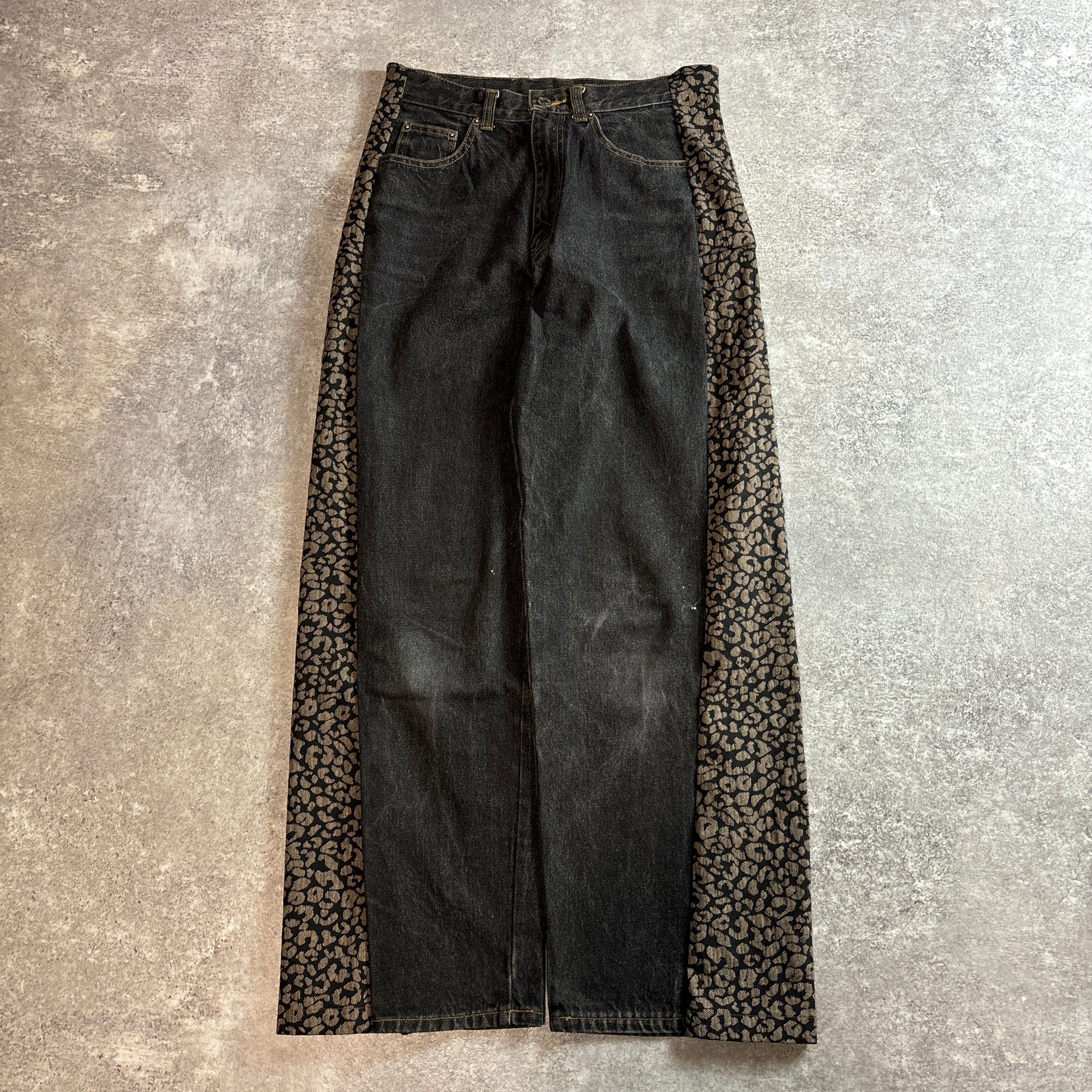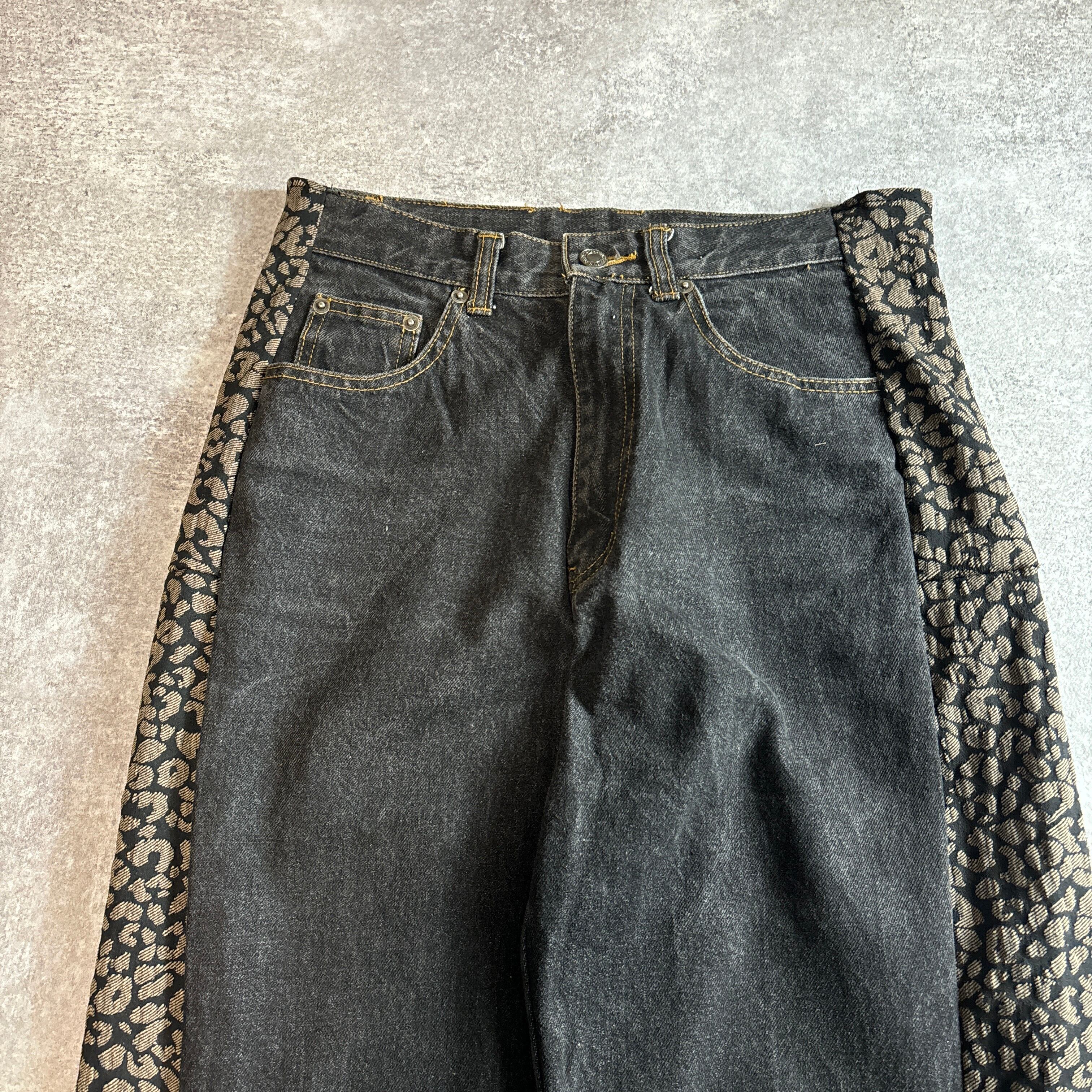 リメイクデニム ワイドパンツ レオパード切替 黒 vol.135