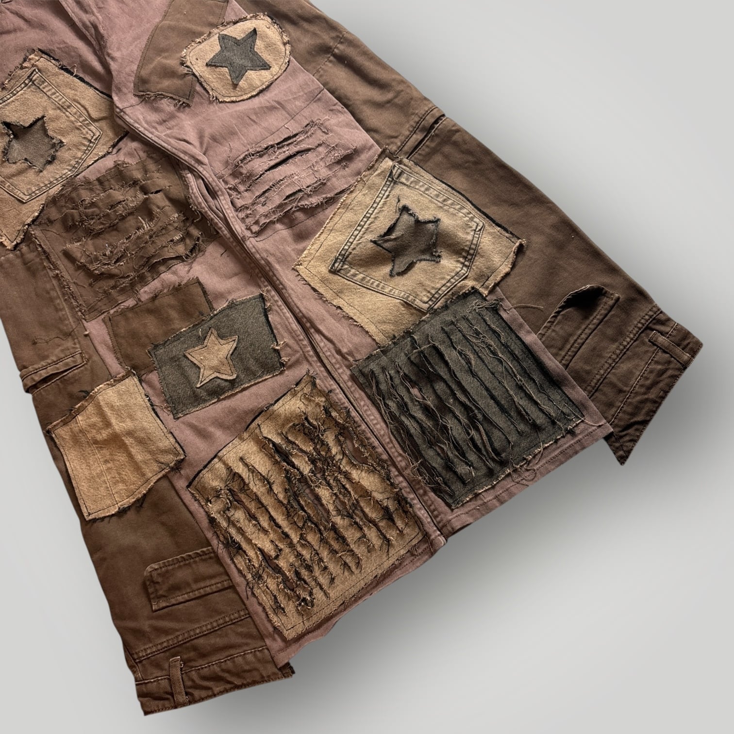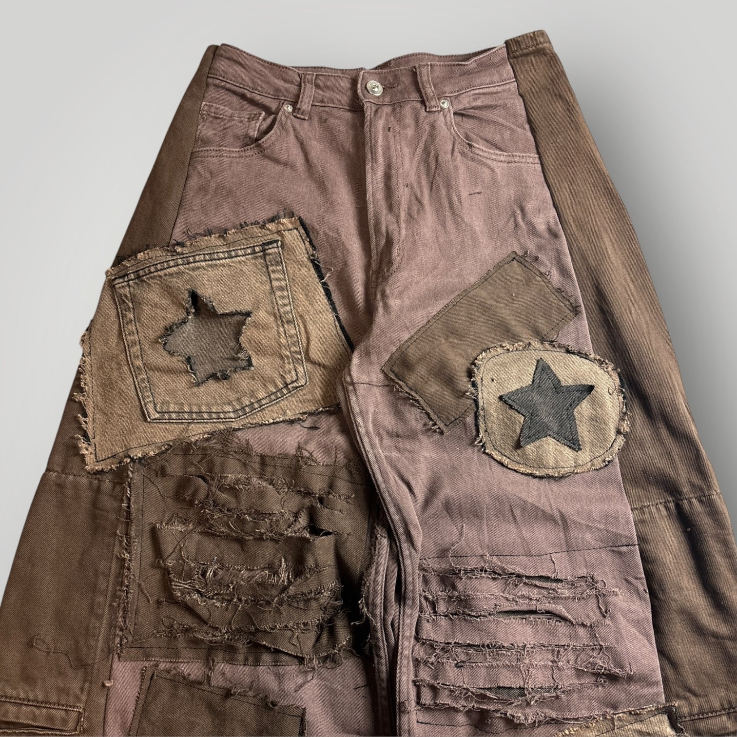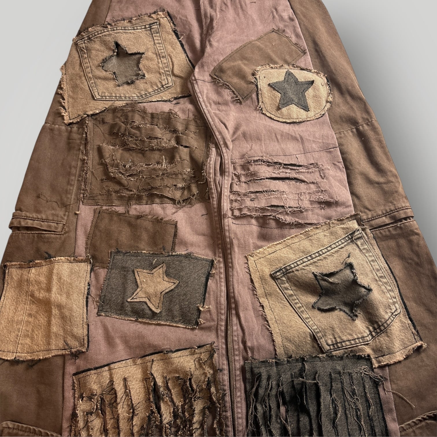 ブラウンベースにパッチワークを施したリメイクパンツ。