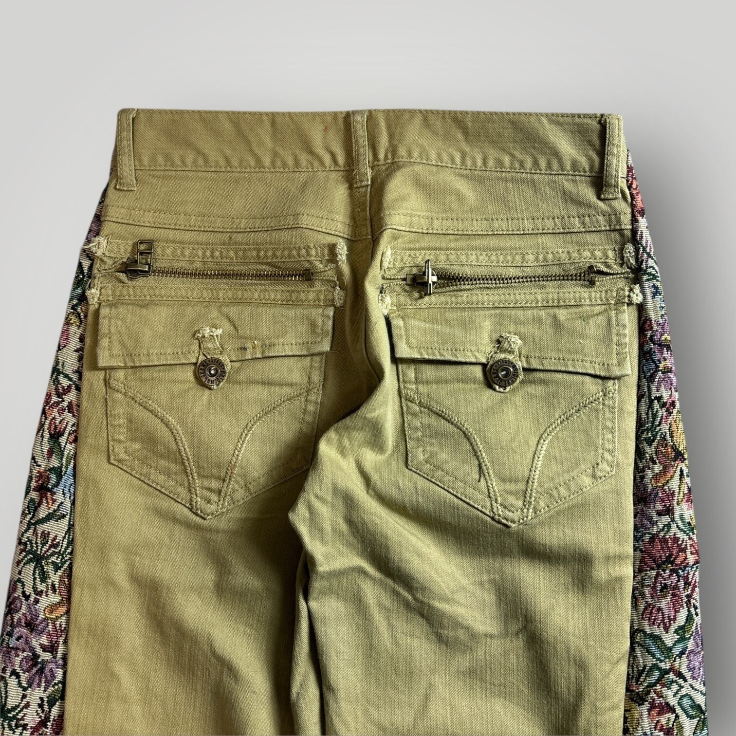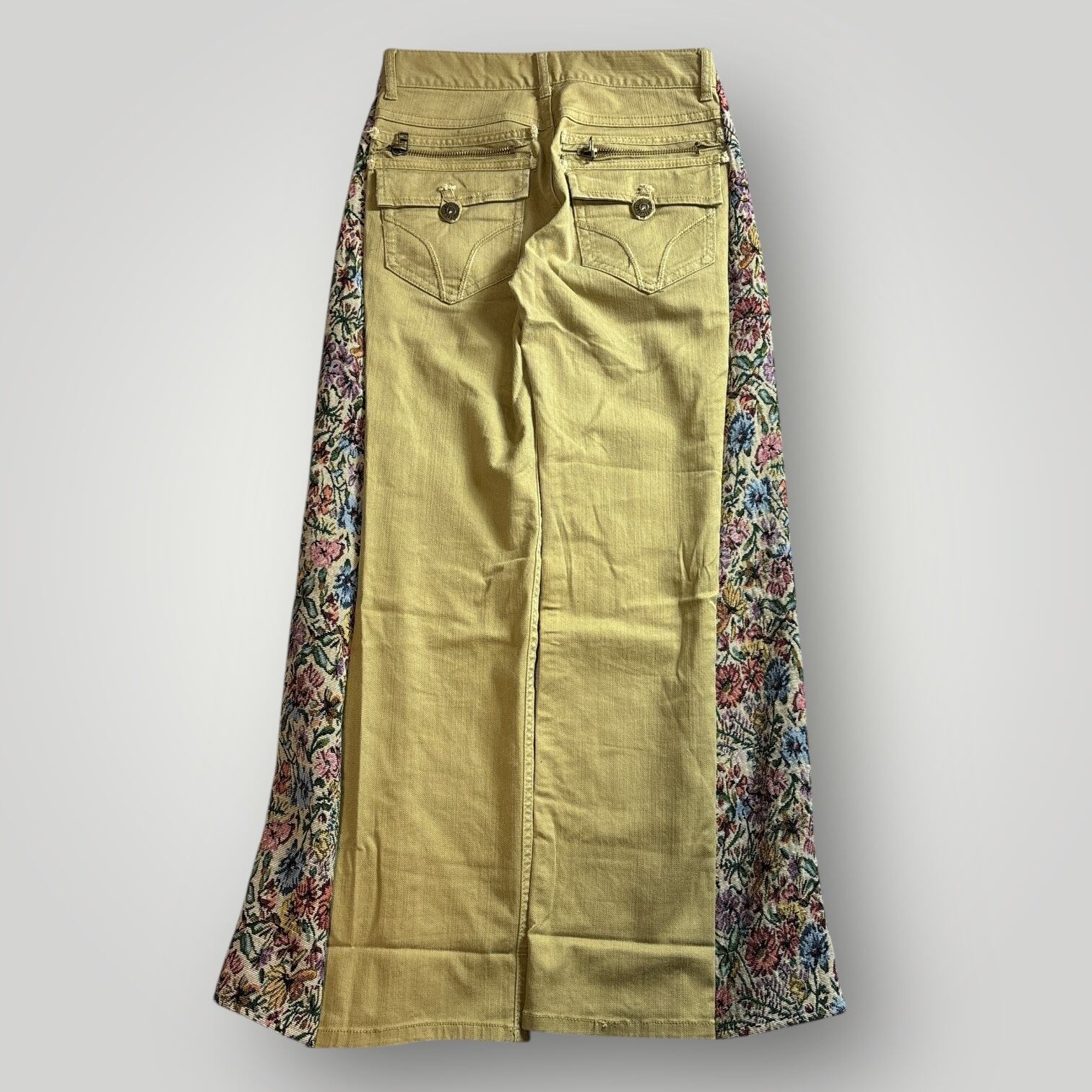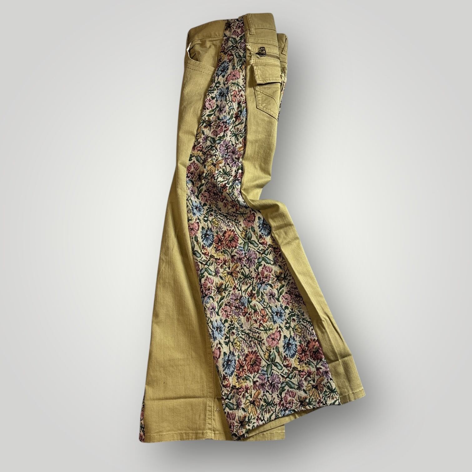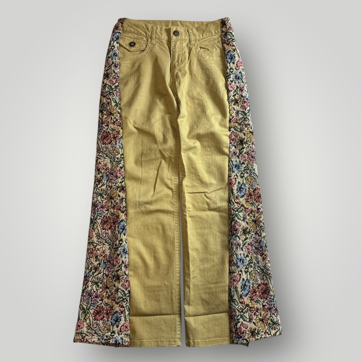 イエローデニムにフラワー柄の生地をサイド切替したリメイクパンツ。