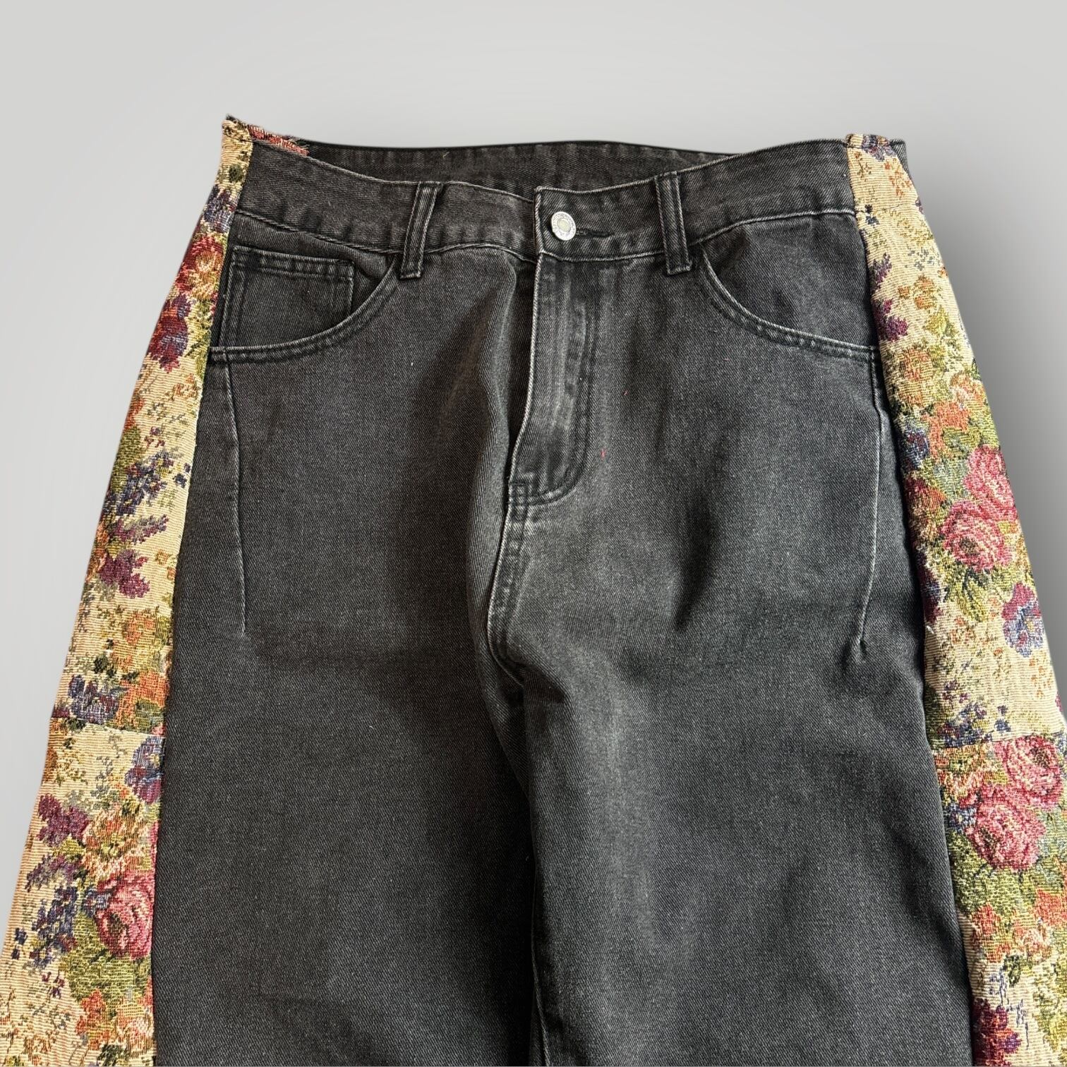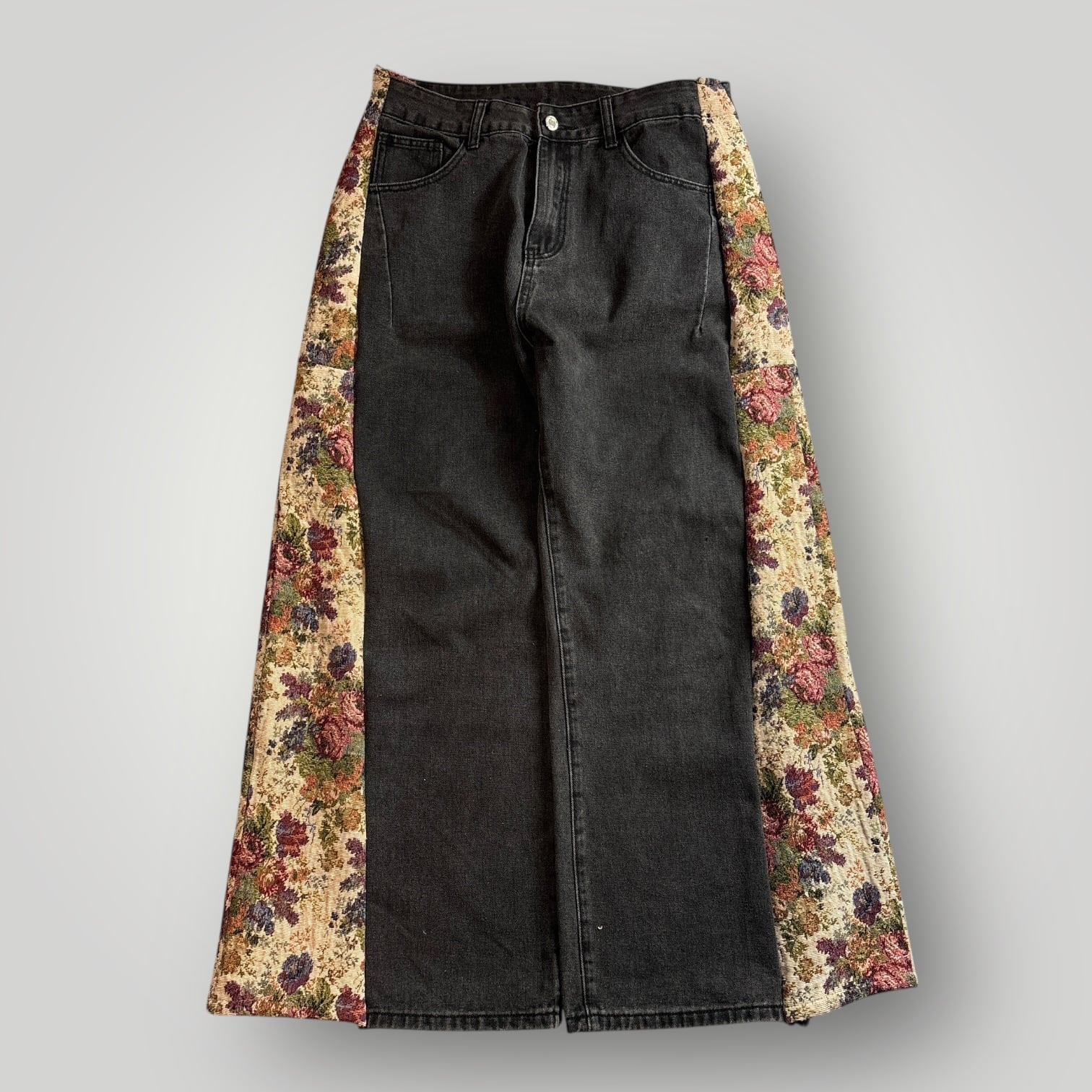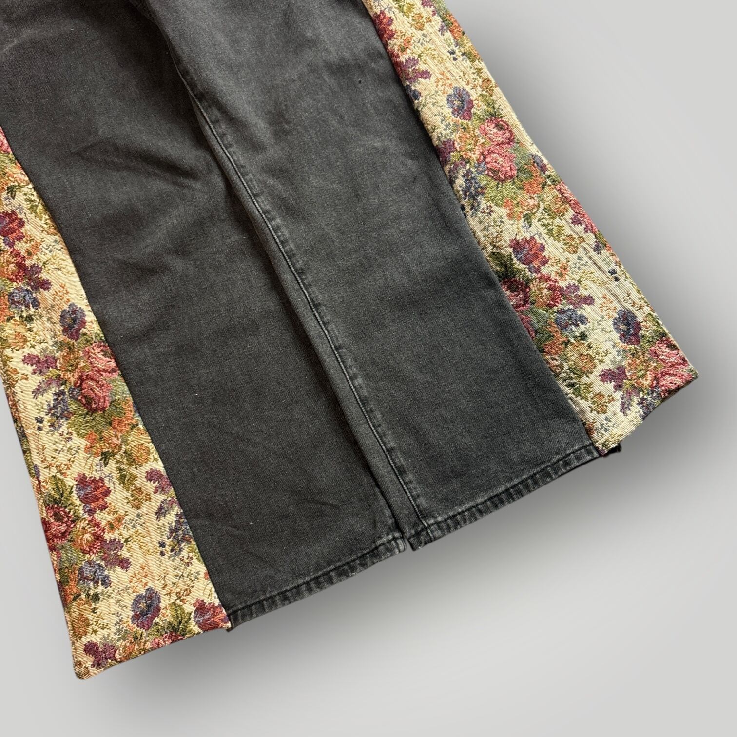 ブラックデニムにフラワー柄のサイドパネルを入れたリメイクパンツ。