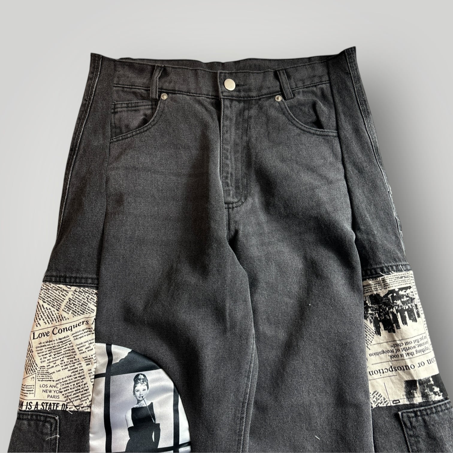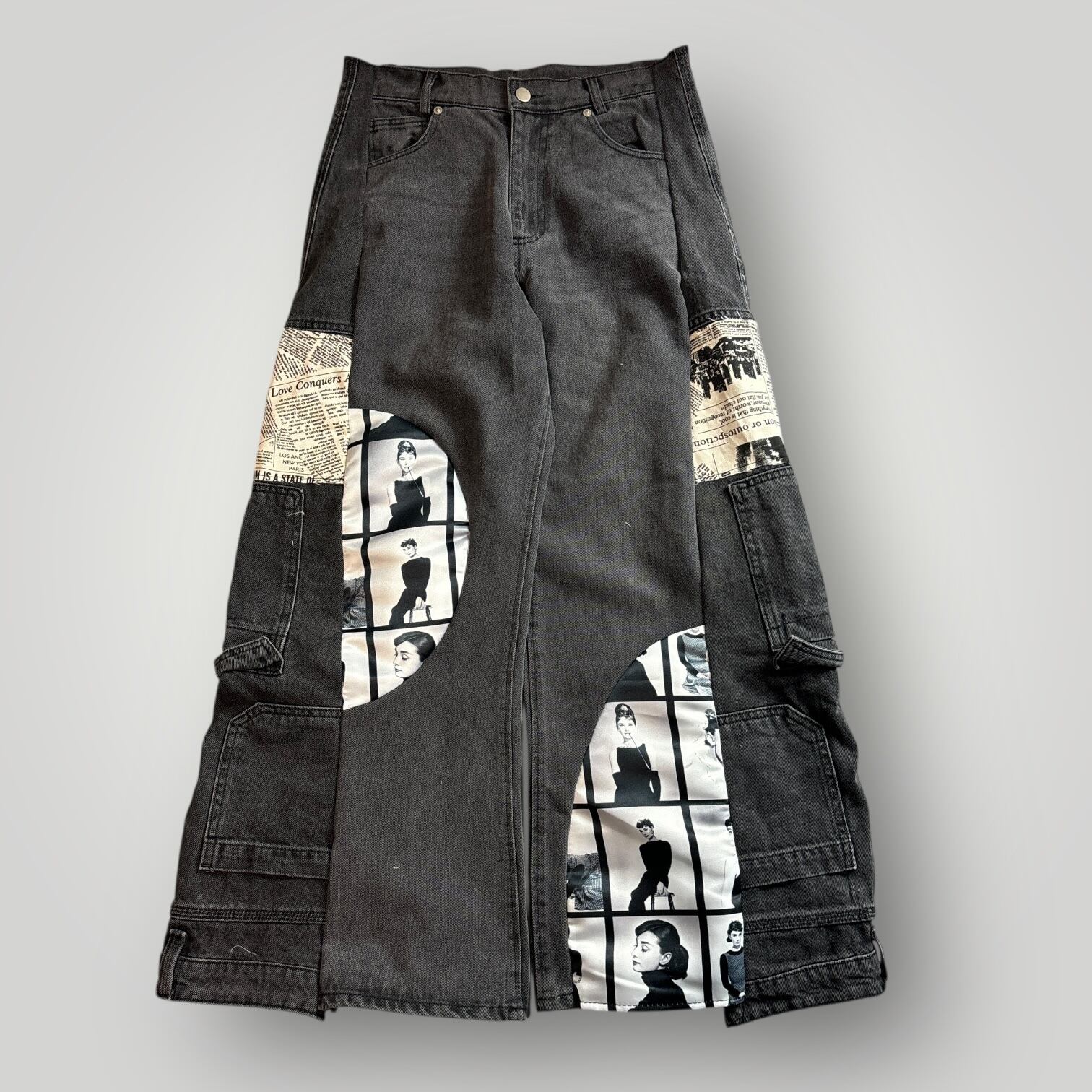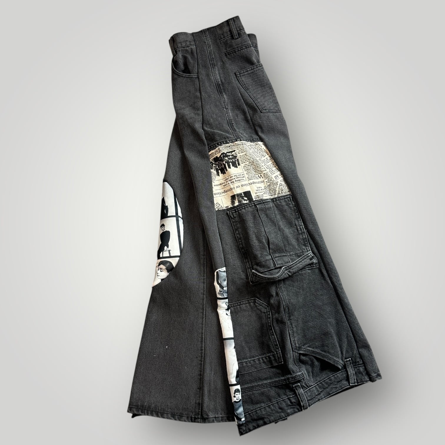 ブラックデニムにフォトプリントと新聞柄を組み合わせたリメイクパンツ。