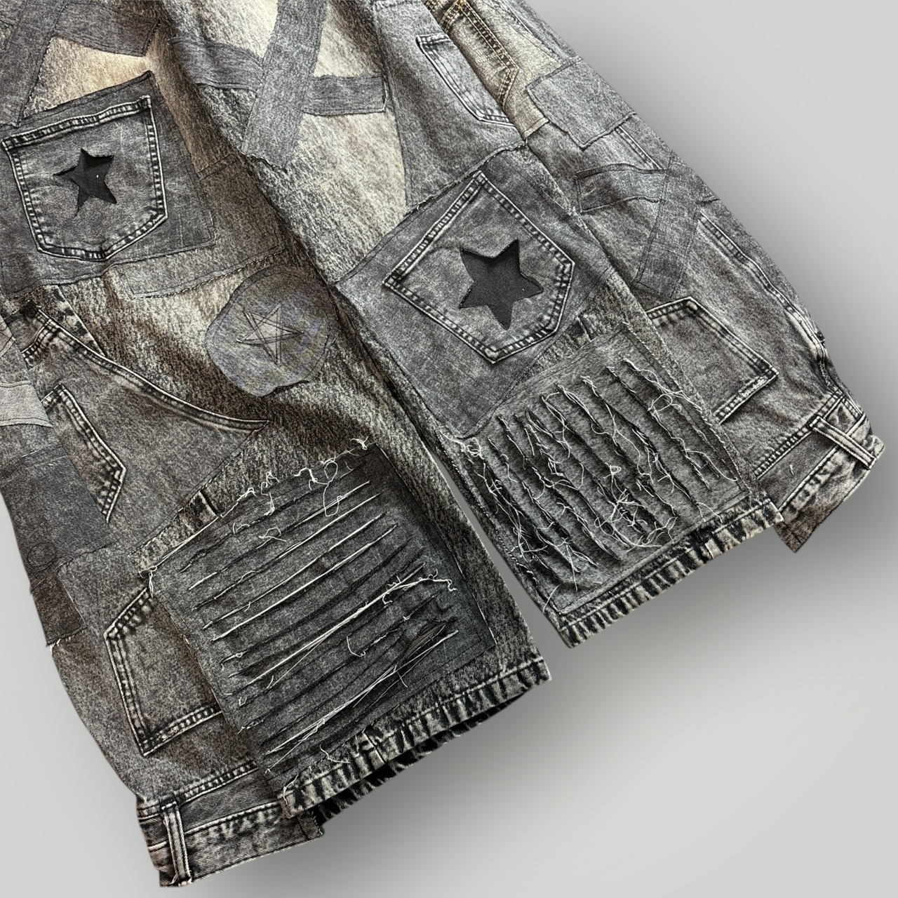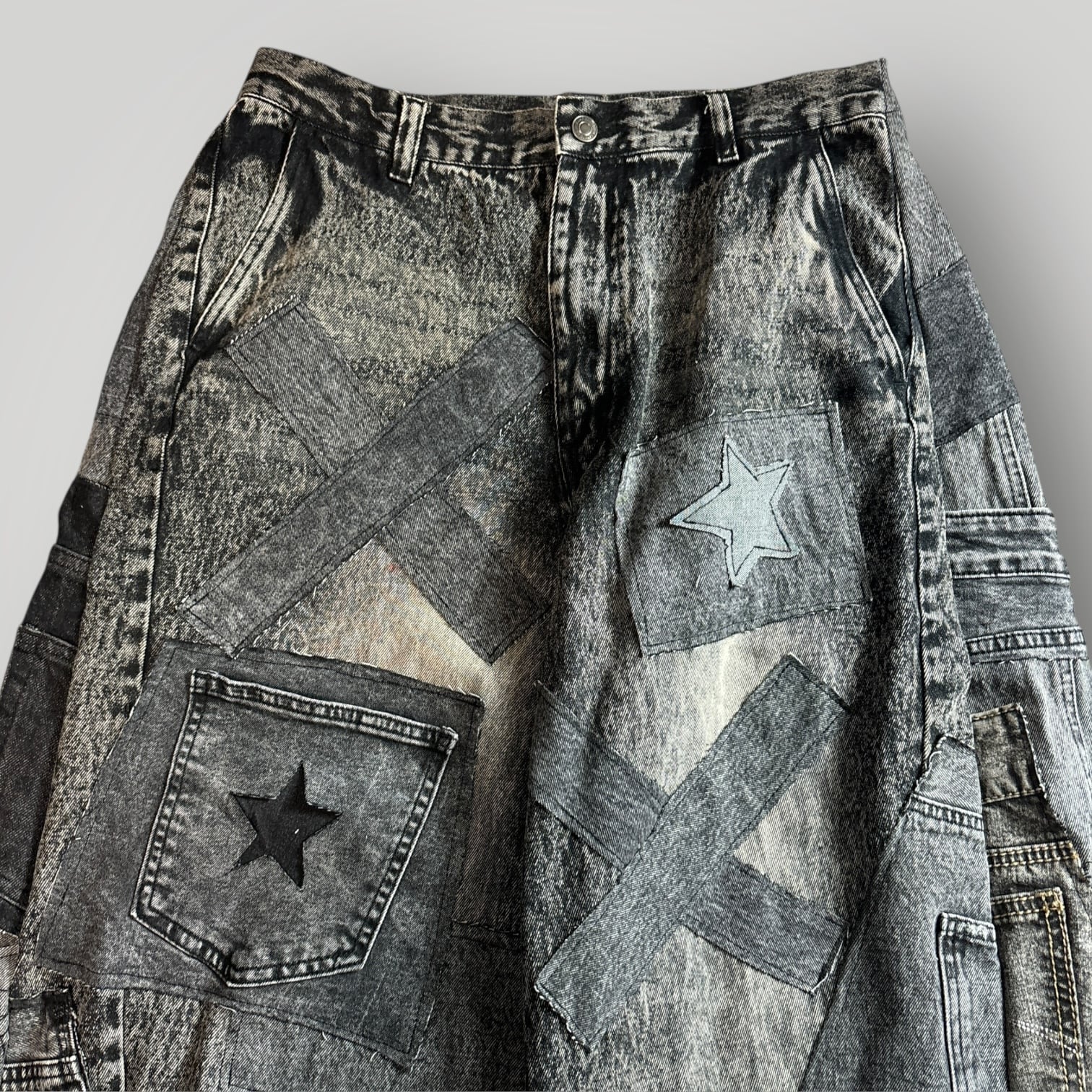 グレーデニムをベースにパッチワークと星デザインを施したリメイクパンツ。